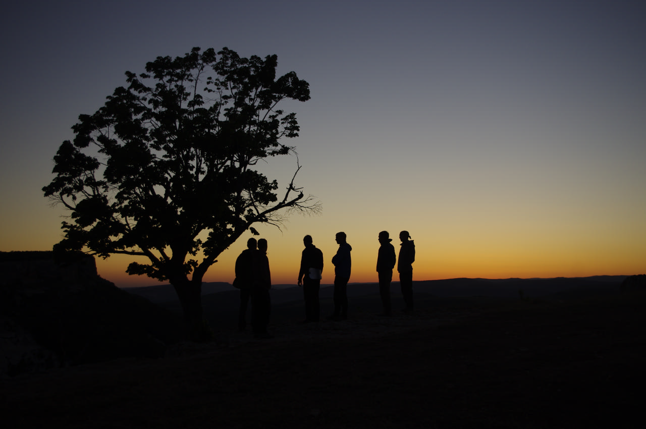[spoiler]Подъем в 5 утра. Идем встречать рассвет на край мира. Удивительно, но на траве нет утренней росы. Поднимаясь ко входу в пещерный город, у подножия которого мы ночевали, желание спать развеивается, ибо перед нами открывается захватывающий вид. Огромная долина внизу нас, а мы на вершине плато. Внизу виден ковер зелени, между деревьями змейкой пробегает грунтовка, ведущая к поселению, находящемуся в тупике каньона. А мы возвышаемся над всем этим и видим все далекооо вокруг. Лучи восходящего солнца едва пробиваются к линии горизонта, окрашивая ее в малиновый цвет. Такое ощущение, что даже воздух тут чище, заполняет легкие больше, чем обычно и ты с жадностью пытаешься вобрать в себя его как можно больше, чтобы насытиться чистотой, легкостью, свободой воздуха…