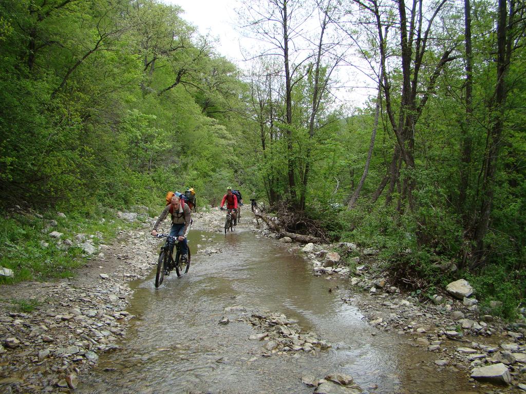 Фраза "обойдете лесом" практически сразу стала частью сложносоставных матерных тирад, т.к. мало того, что дорога состоит из грязи, кустов и там колея в Кирюшкин рост, так ещё и вылезти с дороги на склон горы невозможно, т.к. склоны отвесные. Да и даже если выберешься и проломишься с грузом и великом сквозь кусты, то обратно на дорогу разве что на пузе сползёшь с двух метров-то. Так что переобулись в сланцы, закатали штаны и пошлёпали. Проползли километр, уже думаем, а как дальше то. Мужик сказал, что до кабардинки около 16 км..... ага, 16 миль только если.