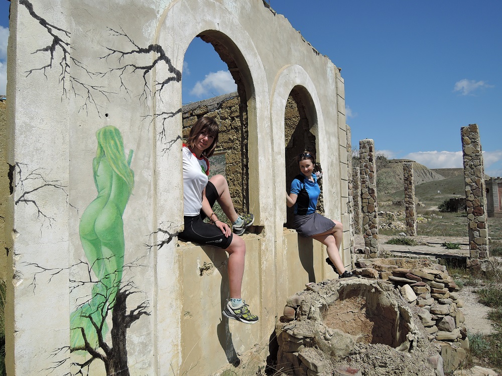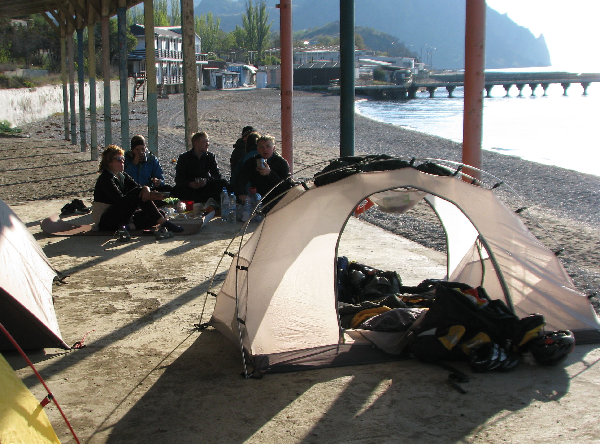 Проехать вдоль бухты мы очутились на развалинах Киногородка, построенного в 2004 году в качестве декораций к фильму "Живая рыба", который, кстати, так и не вышел на экраны. Говорят, на этом месте, после съемок, предприимчивые люди пытались зарабатывать деньги, но потом случился какой-то конфликт и все разрушили, поэтому сейчас все в жутком виде и печальном запустении. В прочем мест под палатки для туристов навалом.