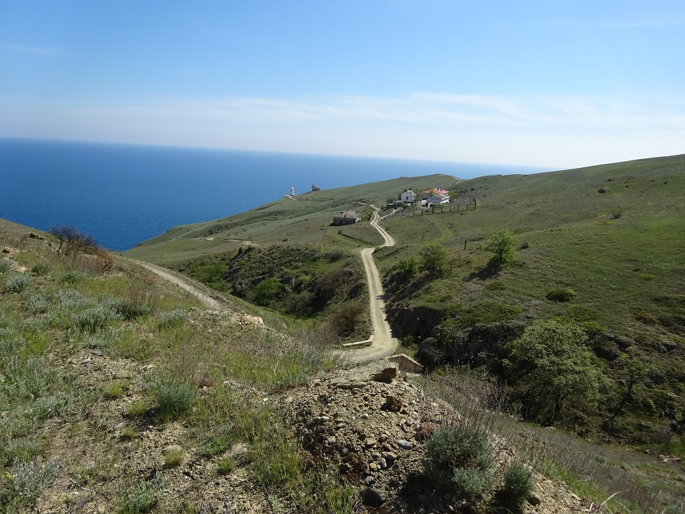 Забрались на высшую точку мыса и пообедали с видом на маяк, затем матрасники приснули, а самые ретивые радиалкой съездили к маяку. Оля с Борей вообще решили поехать в сторону Судака от маяка крутой тропой выводящей с другой стороны мыса. А мы вернулись через ветряные генераторы как и подымались.