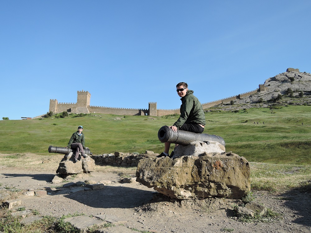 Дорога на Мыс Меганом. На мысе огромные ветряные генераторы.Дорога к маяку на мысе. Оля с Борей спускаются в сторону Судака с другой стороны мыса.Спустились в Судак и сразу поехали осматривать главную достопримечательность, хорошо сохранившуюся генуэзскую крепость ХII века. Крепость действительно смотрится, а виды с нее просто шикарные.