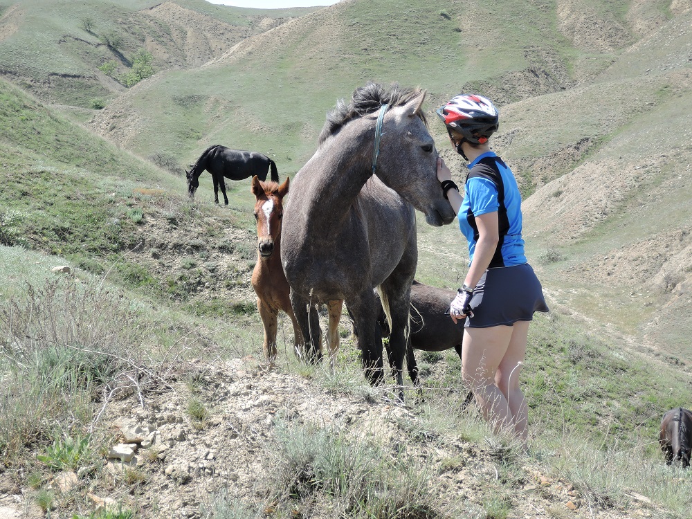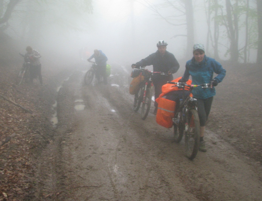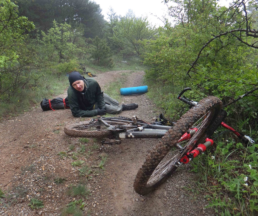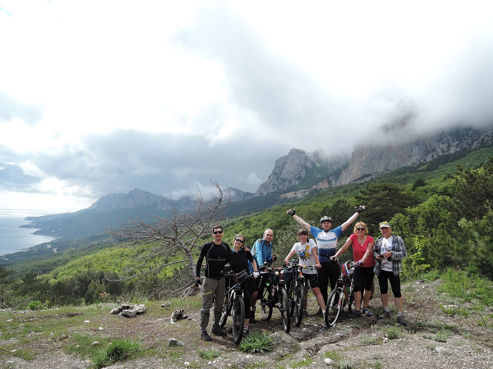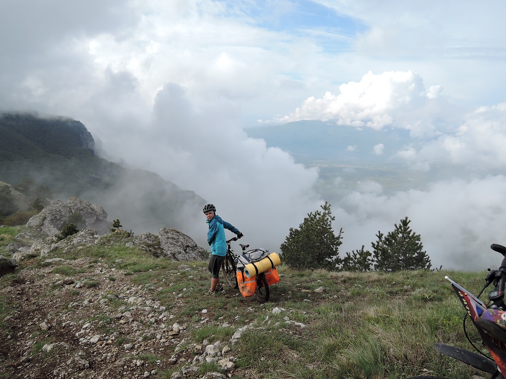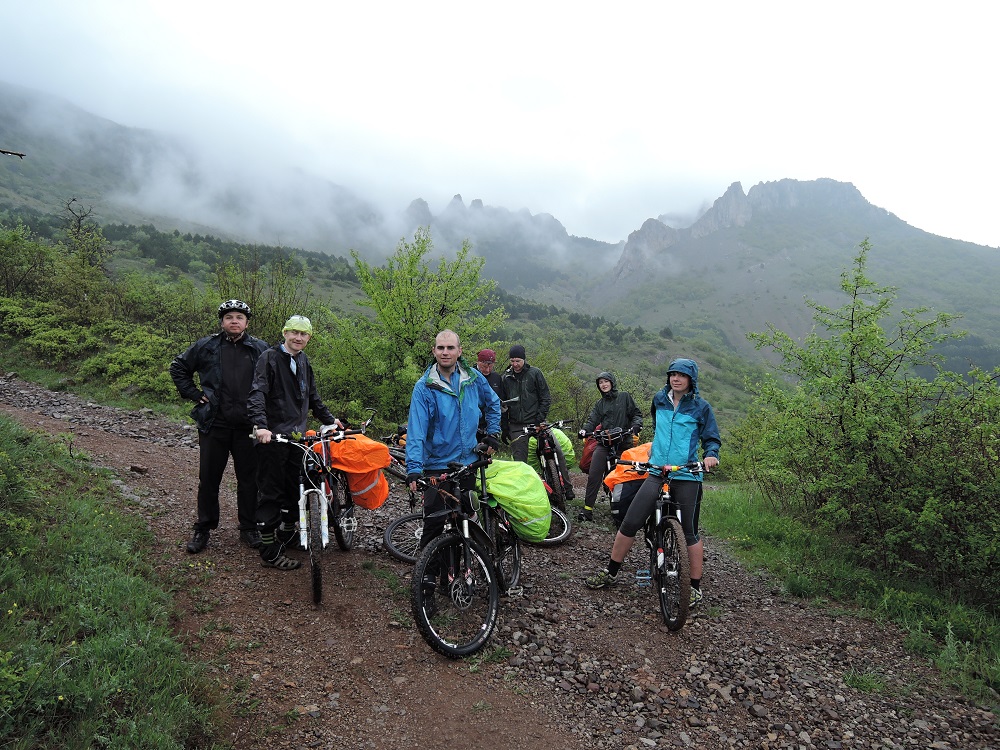 Разминувшись с группой на время ремонта встретились уже у села Морского, несмотря на крутые перевалы, этот участок был по асфальту и крутился без проблем, но дальше нам предстоял затяжной подъем на Караби-Яйлу. Плотно пообедав мы собрались духом и начиная с села Приветливого покрутили в сторону высоких гор. Местами толкая, местами помогая девочкам доползли до высоты 800м и встали на стоянку не дотянув до родника около часа пути, так как начался дождь и начинало темнеть. Проехали сегодня 44км с набором 1653м.