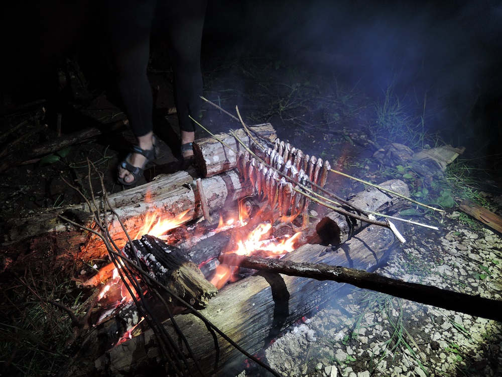 Промокнув до нитки спускаемся в село Орлиное, где пробуем чебуреки с бананами и находим место для ночевки в заброшенном кафе под навесом. На ужин у нас сегодня знаменитая крымская барабуля, которую Оля накануне купила у Ялтинских рыбаков.