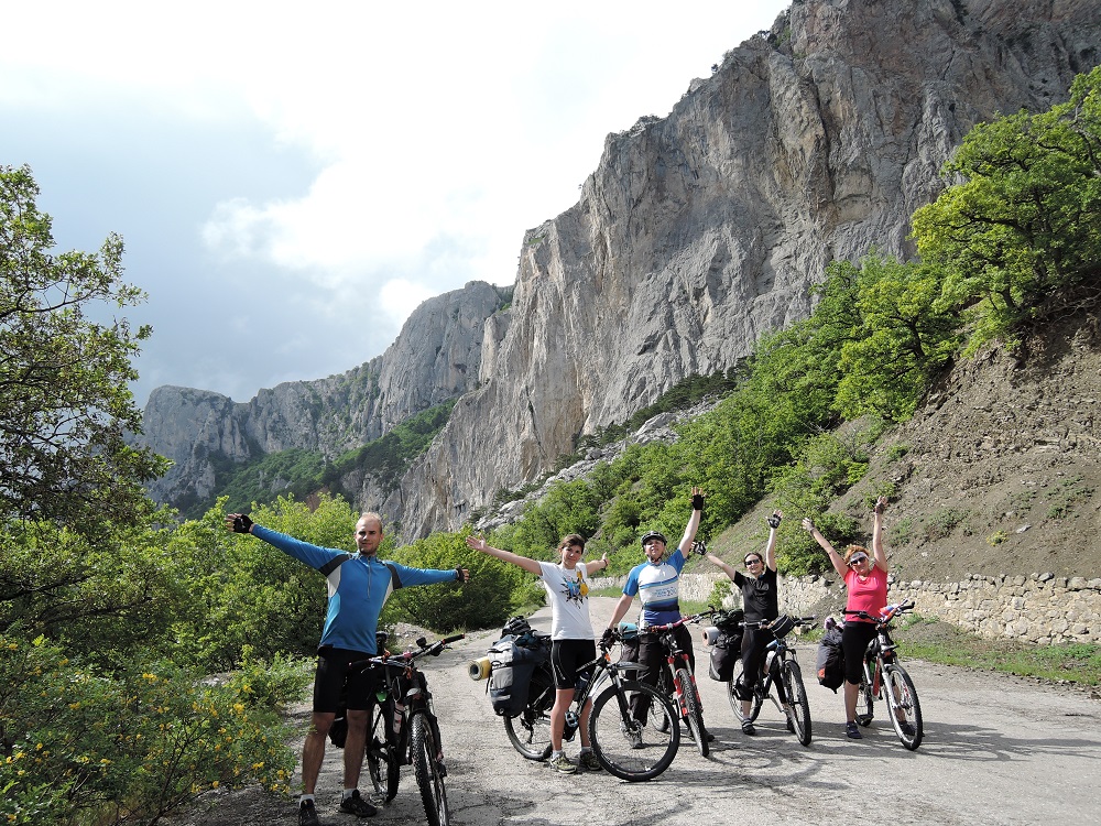 По пути на Демерджи. На вершине.Причудливые скалы Демерджи горы.Далее предстоял затяжной спуск по грязючке, но прокатились весело и с ветерком, с ужасом наблюдая как другие велотуристы там же поднимаются.