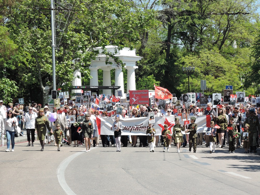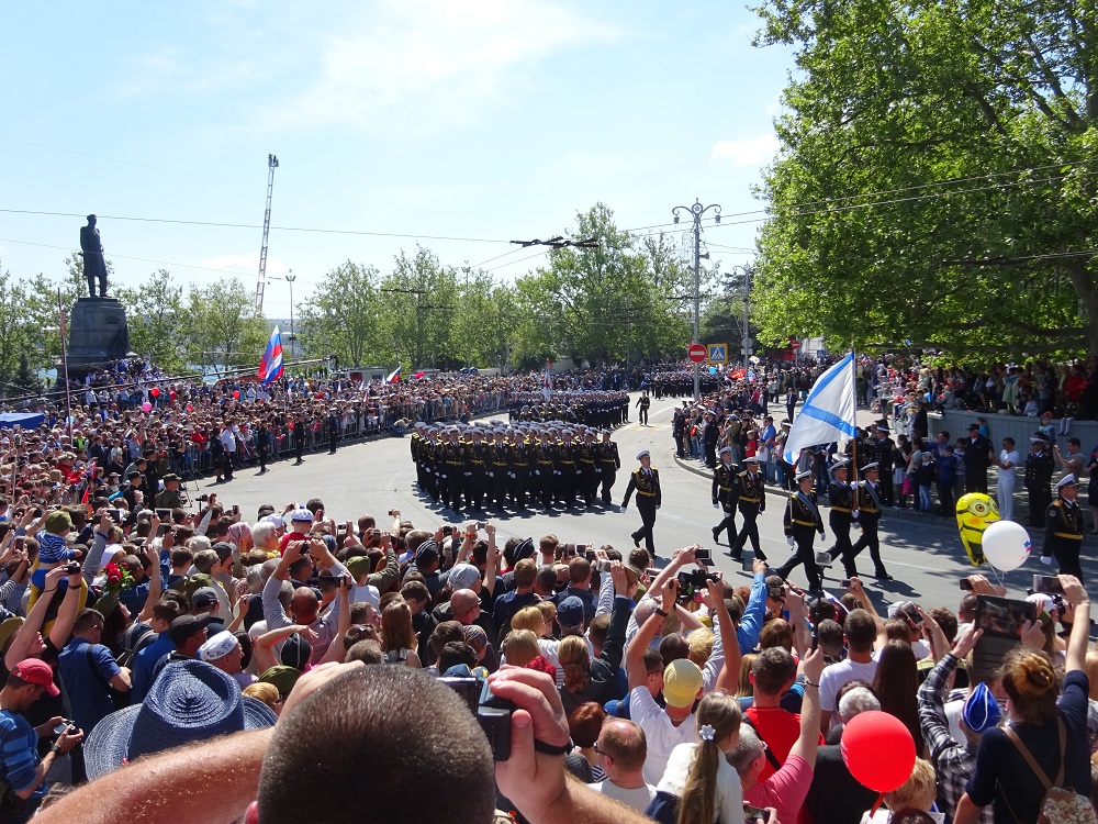 Начало парада. Стартует бессмертный полк.После парада посмотрели концерт военного оркестра, который зажигал не только военные, но и современные мелодии. Затем экскурсия на панораму и музей Черноморского флота, опять прогулки по городу, затарка вином и вечерний поезд Севастополь - Керчь (кстати, да, теперь такой ходит, раньше это были отдельные электрички). С Керчи также на велах на паром до пос.Ильич и домой на машинах. Такой вот интересный у нас был велопоход. Рекомендую, только в дождь на яйлы с осторожностью. )) Трек скину позже. Крым не перестает удивлять, очень достойное место для туризма, действительно "Остров Свободы"!