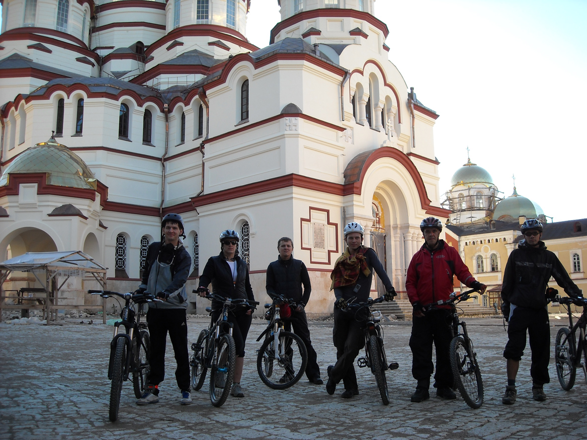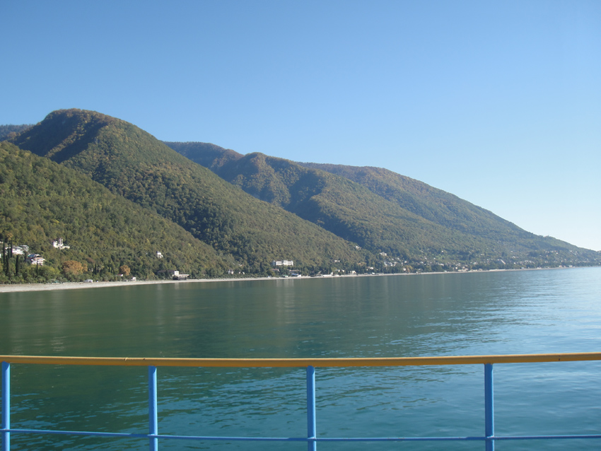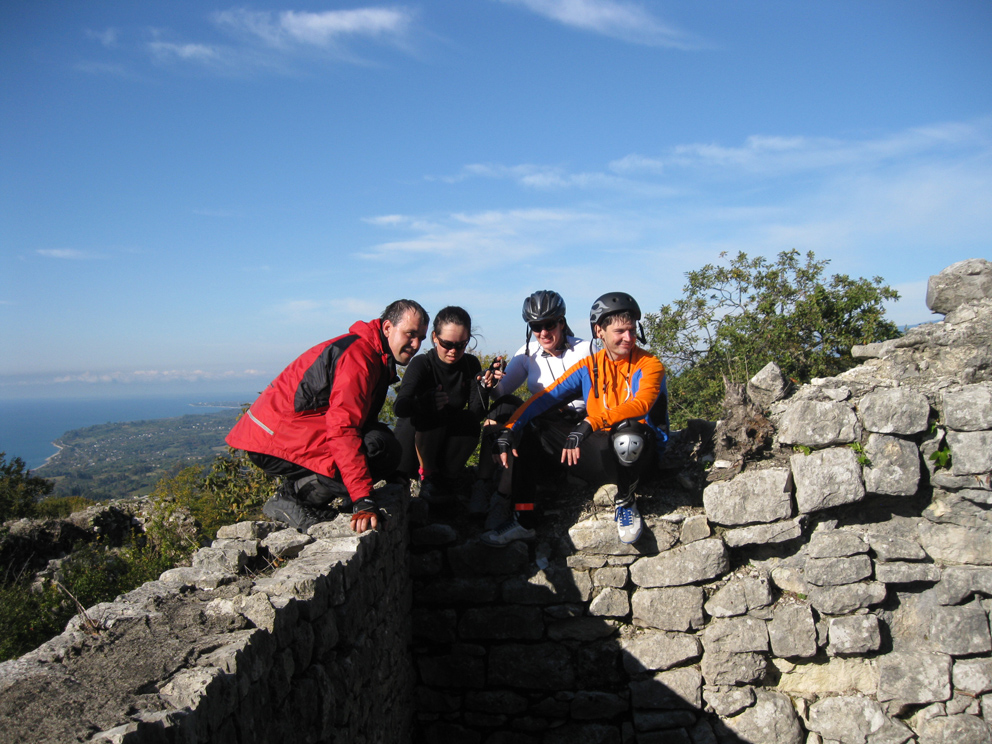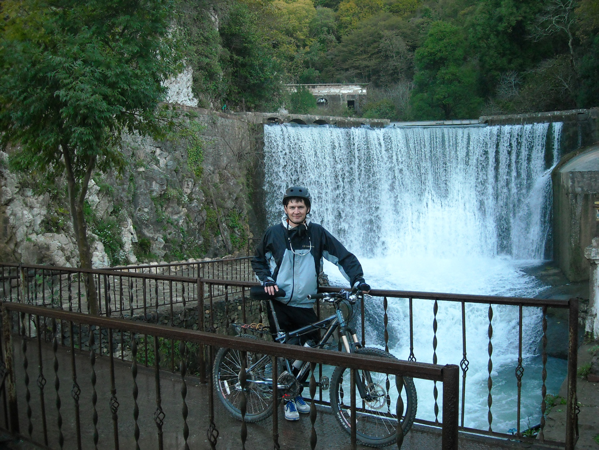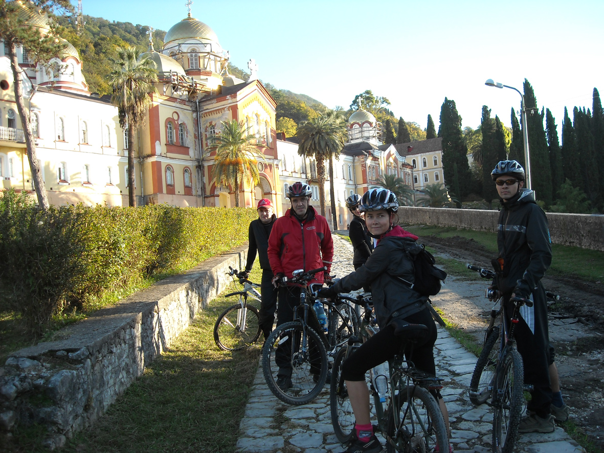 В общем пещера мне понравилась, не то чтобы прям за душу взяло, нет, ничего сверхестественного там нет, девчонок так вообще не впечатлило, но мне понравилось, если кто был в пещере азишской, так я скажу вам — афонская гораздо круче, последний зал вообще классный, оч. понравился. После него опять выходишь на мини-метро и уезжаем уже из другого места. Вышли в час, сразу поехали за вещами, по пути увидел красивое озеро в центре с кафе, приехали на квартиру, быстро попили чаю, перекусили и погнали. Афон конечно весь очень красивый город, хоть и не большой, но даже просто походить по нему приятно, красивые дороги и много достопримечательностей. Выехали аж в 14:00, отклонились от графика на 2 часа, но пещера того стоила, и мы осознано шли на то, что мы приедим в Пицунду по темну, к тому же в Гудауту (в пос.Лыхны) решили не заезжать, по словам местных, ничего там интересно нет, княжеский дворец - одна развалина, а храм не впечатляет. По дороге к нам присоединился ВелоТур до Гудауты, дальше они свернули на Мысру, ехали мы может даже чуть быстрее, но за счет остановок и поломок, получилось одинаково, Сергей-А встал ведущим, ехали на колесе, темп он взял конечно приличный, даже в подъемы ниже 26км/час не ехали. Серега М у нас на колесе ездить не умеет, все время немного левее едет. На одном из участков у него падаете насос, он резко тормозит не подняв руку, тут же тормозит Макс за ним, я за Максом не успеваю среагировать въезжаю ему в заднее колесо, и красиво так (прям для видеороликов) лечу через руль шлемом ему смачно попадаю в рюкзак, хорошо что у него рюкзак на плечах, а то я бы ему и сломать мог что-нибудь на спине, Макс от удара бьется неприятно коленом об раму, потом она у него болела. Обматерили Серегу М, у меня от удара передним колесом сбивается тормоз, колесо начинает притормаживать. Проезжаем пост ГАИ, какой-то урод из УЧС (управления по чрезвычайным ситуациям) на черном БМВ в зеленой форме подрезает наших прямо у поста, сказал ментам, чтобы нас остановили, нахамил Кате, сказал нам, что мы едим как стадо баранов и начинает жаловаться главному гаишнику на КПП (вроде капитан), что мы типо его по дороге подрезали и чуть не сбили, ведет себя по хамски. Оля из велотура рассказала потом, что они ездили в прошлом году в двоем там и он по дороге остановил их и в наглую сказал, что если вы типо хотите ехать дальше гоните деньги, вроде они тогда отделались всего за 100руб. и неприятным моментом «», но все таки, вот такое там УЧС, в который Даша как-то советовала оставить маршрут движения для безопасности, да ну их в баню, лучше там ничего не оставлять. К счастью гаишник оказался хорошим мужиком, зовут его Игорь, мало того, что он успокоил этого «зеленого», так еще и сопровождал нас до самой Гудауты, потом дал нам свой мобильный, записал наш и далее поехал с велотуром, а нас сопровождала другая машина ГАИ до Бзыбты. Хотя внешне не казалось, что есть в этом необходимость, но ехать было по трассе спокойней, когда за тобой машина сопровождения. После пары километров, как случилась неприятность с тормозом я понял, что ехать дальше так не смогу за толпой с такой скоростью, останавливаюсь отрегулировать тормоз, более или менее отрегулировал, но все равно не получается настроить, обычно у меня быстро получается, а тут прям чувствую что-то не то, еду дальше еще через несколько километров начина