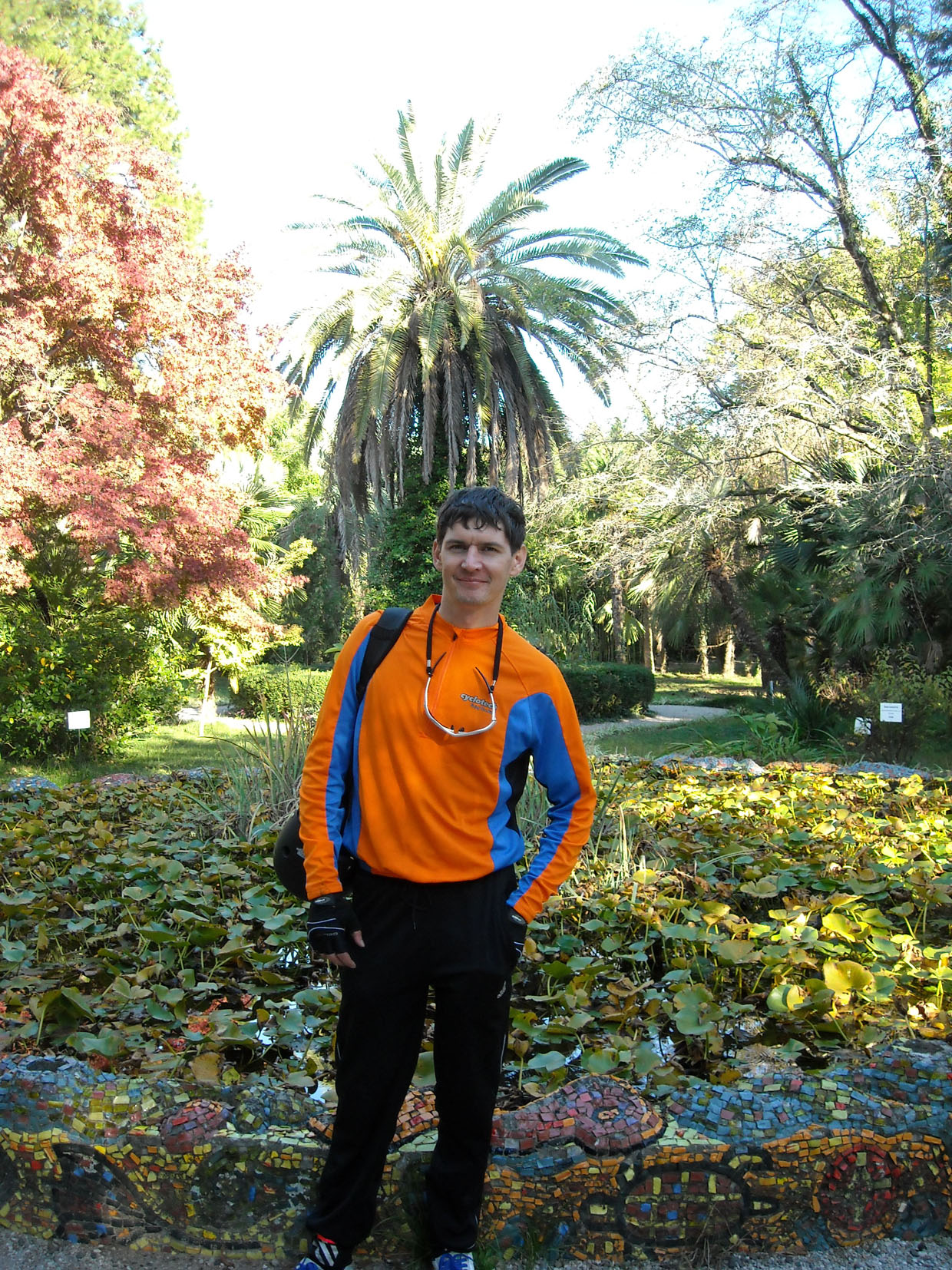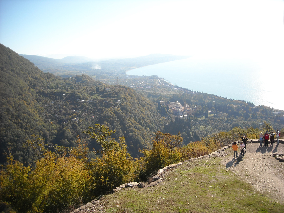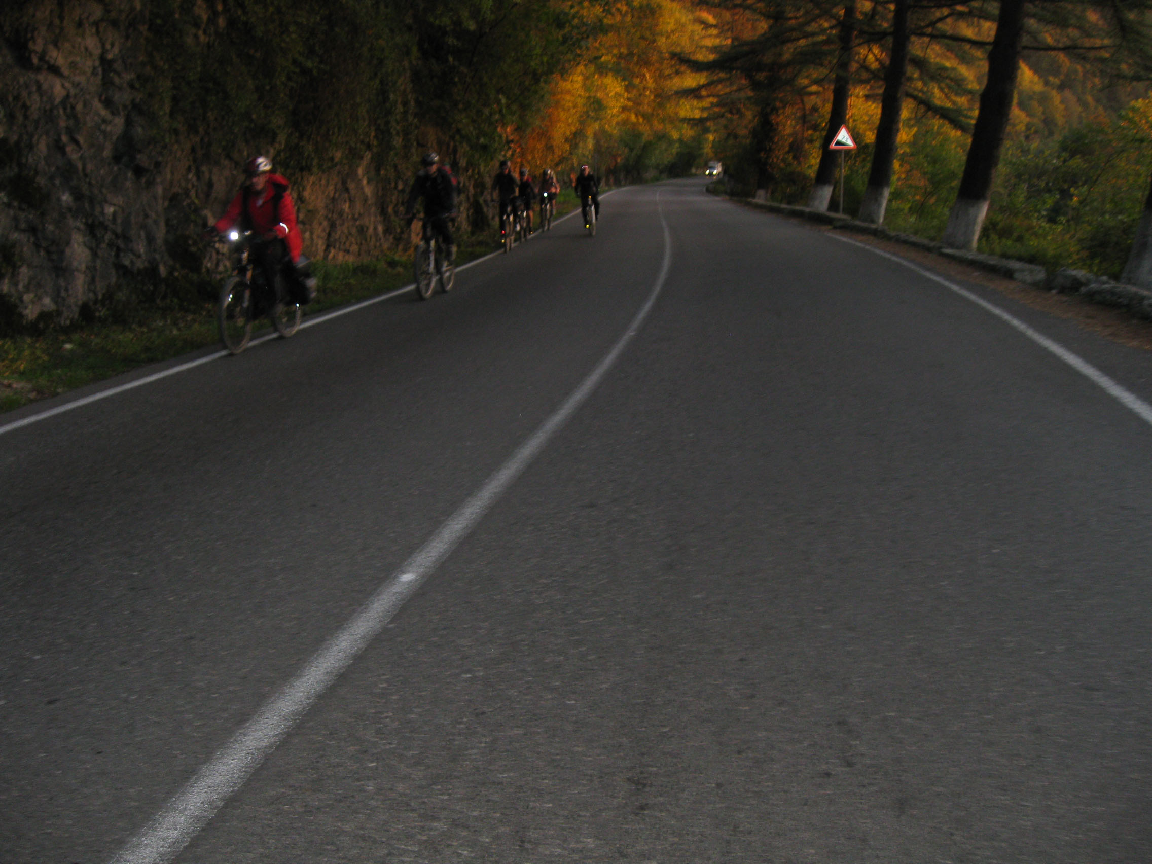 В общем пещера мне понравилась, не то чтобы прям за душу взяло, нет, ничего сверхестественного там нет, девчонок так вообще не впечатлило, но мне понравилось, если кто был в пещере азишской, так я скажу вам — афонская гораздо круче, последний зал вообще классный, оч. понравился. После него опять выходишь на мини-метро и уезжаем уже из другого места. Вышли в час, сразу поехали за вещами, по пути увидел красивое озеро в центре с кафе, приехали на квартиру, быстро попили чаю, перекусили и погнали. Афон конечно весь очень красивый город, хоть и не большой, но даже просто походить по нему приятно, красивые дороги и много достопримечательностей. Выехали аж в 14:00, отклонились от графика на 2 часа, но пещера того стоила, и мы осознано шли на то, что мы приедим в Пицунду по темну, к тому же в Гудауту (в пос.Лыхны) решили не заезжать, по словам местных, ничего там интересно нет, княжеский дворец - одна развалина, а храм не впечатляет. По дороге к нам присоединился ВелоТур до Гудауты, дальше они свернули на Мысру, ехали мы может даже чуть быстрее, но за счет остановок и поломок, получилось одинаково, Сергей-А встал ведущим, ехали на колесе, темп он взял конечно приличный, даже в подъемы ниже 26км/час не ехали. Серега М у нас на колесе ездить не умеет, все время немного левее едет. На одном из участков у него падаете насос, он резко тормозит не подняв руку, тут же тормозит Макс за ним, я за Максом не успеваю среагировать въезжаю ему в заднее колесо, и красиво так (прям для видеороликов) лечу через руль шлемом ему смачно попадаю в рюкзак, хорошо что у него рюкзак на плечах, а то я бы ему и сломать мог что-нибудь на спине, Макс от удара бьется неприятно коленом об раму, потом она у него болела. Обматерили Серегу М, у меня от удара передним колесом сбивается тормоз, колесо начинает притормаживать. Проезжаем пост ГАИ, какой-то урод из УЧС (управления по чрезвычайным ситуациям) на черном БМВ в зеленой форме подрезает наших прямо у поста, сказал ментам, чтобы нас остановили, нахамил Кате, сказал нам, что мы едим как стадо баранов и начинает жаловаться главному гаишнику на КПП (вроде капитан), что мы типо его по дороге подрезали и чуть не сбили, ведет себя по хамски. Оля из велотура рассказала потом, что они ездили в прошлом году в двоем там и он по дороге остановил их и в наглую сказал, что если вы типо хотите ехать дальше гоните деньги, вроде они тогда отделались всего за 100руб. и неприятным моментом «», но все таки, вот такое там УЧС, в который Даша как-то советовала оставить маршрут движения для безопасности, да ну их в баню, лучше там ничего не оставлять. К счастью гаишник оказался хорошим мужиком, зовут его Игорь, мало того, что он успокоил этого «зеленого», так еще и сопровождал нас до самой Гудауты, потом дал нам свой мобильный, записал наш и далее поехал с велотуром, а нас сопровождала другая машина ГАИ до Бзыбты. Хотя внешне не казалось, что есть в этом необходимость, но ехать было по трассе спокойней, когда за тобой машина сопровождения. После пары километров, как случилась неприятность с тормозом я понял, что ехать дальше так не смогу за толпой с такой скоростью, останавливаюсь отрегулировать тормоз, более или менее отрегулировал, но все равно не получается настроить, обычно у меня быстро получается, а тут прям чувствую что-то не то, еду дальше еще через несколько километров начина