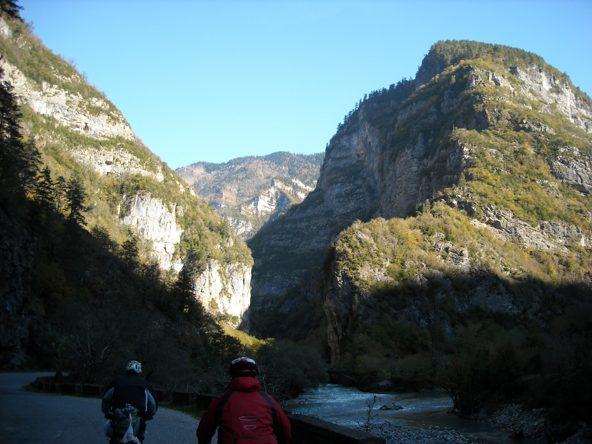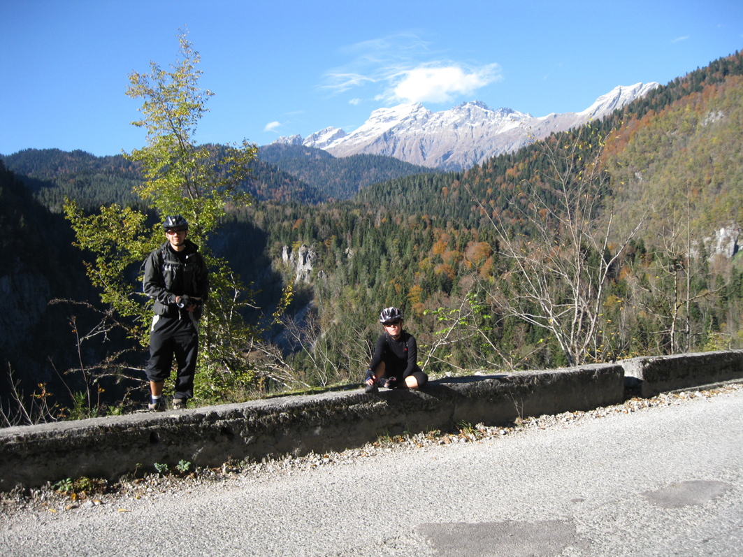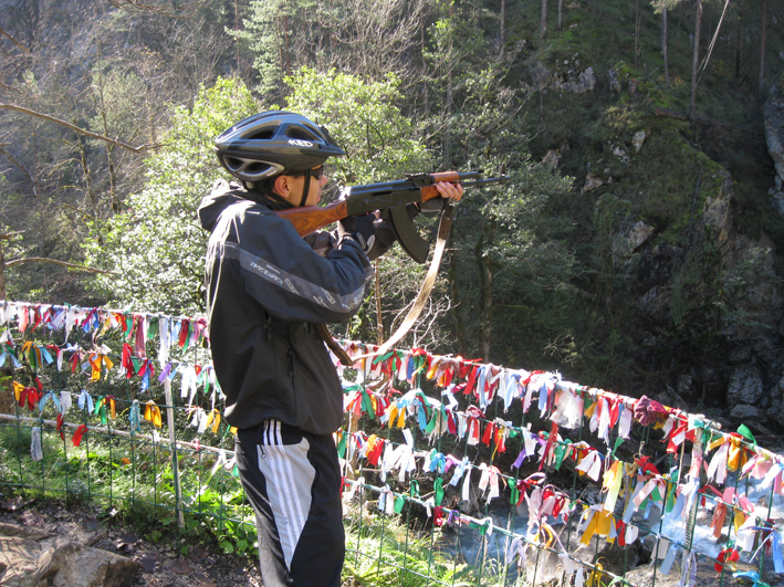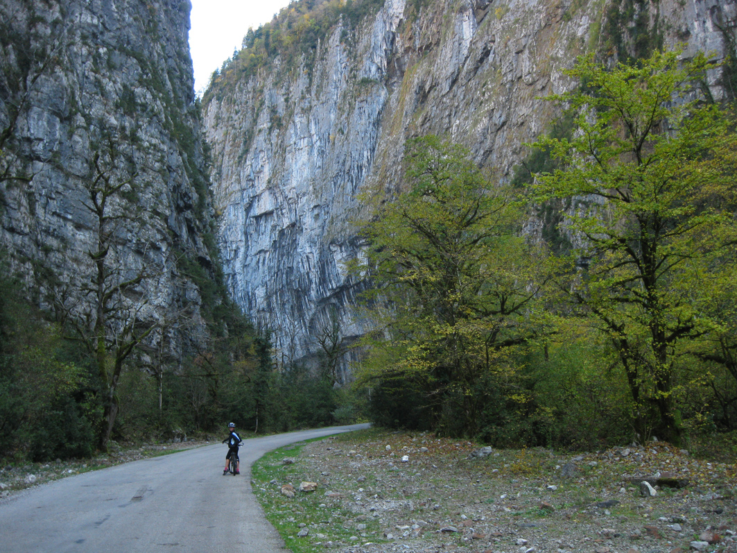 А потом еще Лена за 100руб.прокатилась. Кто не хотел кататься на тарзанке предприимчивый мужик предлагал пострелять с калаша, Макс и Сергей-альпинист стрельнули по водопаду за 100р патрон, эхо было пипец какое, зато фотки зачетные. Поехали дальше на рицу, после ручья начинается крутой подъем с серпантином, надо признать что народ меня напугал крутизной, закрутили мы туда совершенно спокойно, ни разу я не шел пешком, останавливаясь лишь на фото и не разу не включал даже 1-1, на 1-2 и на 1-3 я спокойно наслаждаясь красотами вкрутил сам, ни за кем не гонясь, в своем темпе, Саша вкрутил даже быстрее, он вообще в этой поездке открыл в себе лося. Чувстовал я себя замечательно, как и Саша по пути недоумевал, ну где же тот крутой подъем о котором все говорили, и я вас уверяю я далеко не любитель вкручивать и далеко не лось, просто там действительно не так уж все страшно, за счет серпантина подъем не крутой, просто он длинный. 61 км от Пицунды проехали.