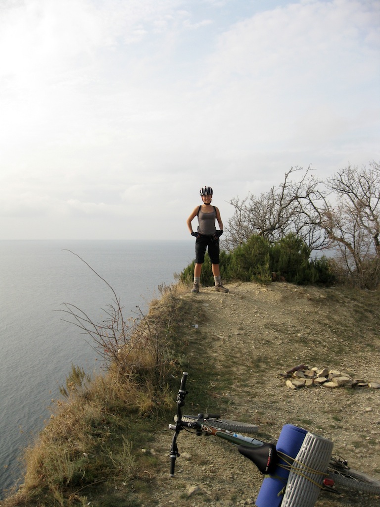 А после нас ждал затяжной подъем на г.Кобыла. Ехать там было не возможно, поэтому мы с Наташкой короткими перебежками поднимались пешком, Серега с Леной к нашему удивлению продолжали и продолжали крутить) На самом деле ребята просто молодцы, не смотря на то что мы объективно не могли ехать в их темпе они нас всегда ждали на всех развилках и привалах. На вершине перевала нас ждал неожиданный сюрприз) Самый настоящий диван, кем то заботливо оставленный что бы после подъема можно было 10 минут хорошенько отдохнуть перед спуском в Малый Утриш. Спуск это конечно отдельная песня, именно там понимаешь зачем тащил подвес в гору))