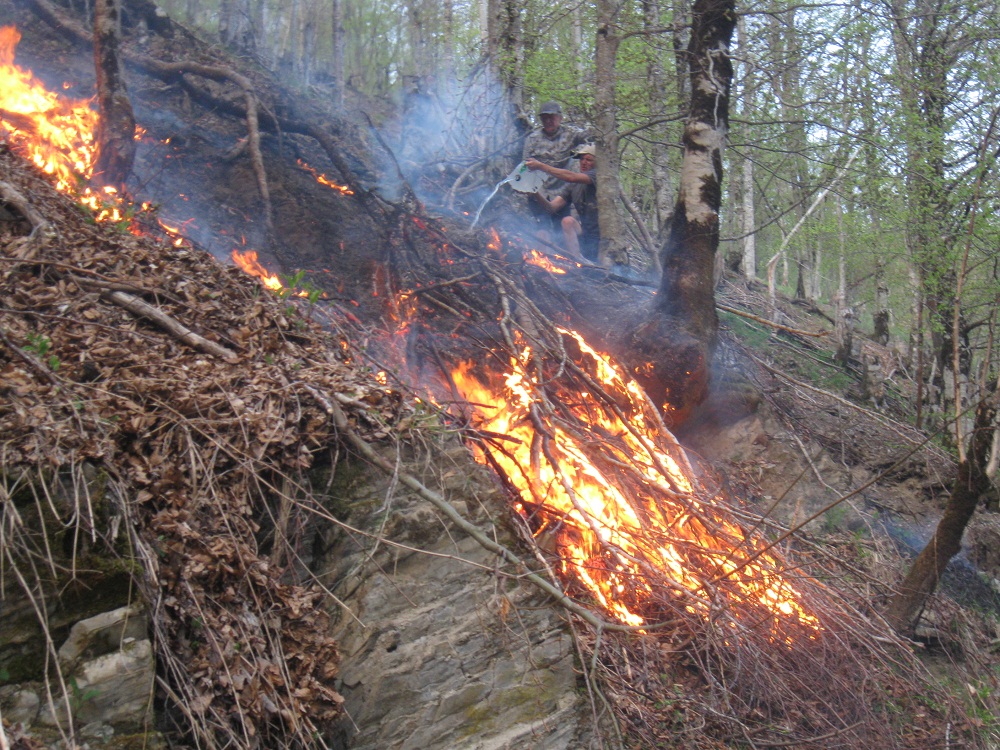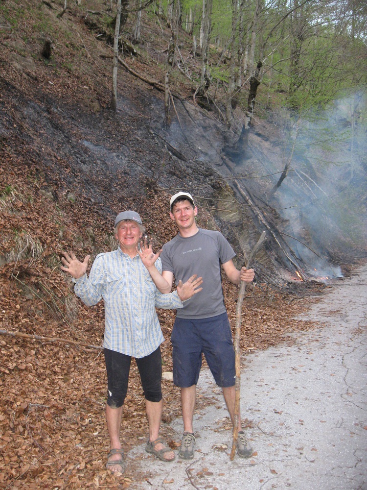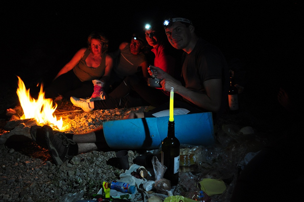 от силы огня, жар был ужасный, а крутость подъема на котором он горел мешала добиратся до нужных мест, постепенно теряя уверенность в возможности его потушить я уж было собрался ехать в деревню и сообщить о пожаре, но тут благодаря отчаянным действиям Бори мы спихнули главное бревно которое никак не получалось скинуть вниз, затем стало полегче мы расчищали вокруг огня листья и палки не давая огню распространятся постепенно потушив и весь пожар. Слегка офигевшие и чумазые, но довольные проделанной работой мы купаемся в холоднющей и бурлящей реке, переодеваемся и выпиваем со всеми за удачный и очень интересный день. Да, мы искатели приключений, ищем их на то самое, родное место и получаем настоящий кайф найдя выход.