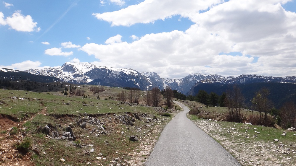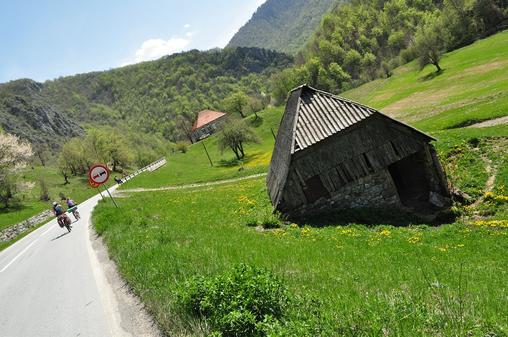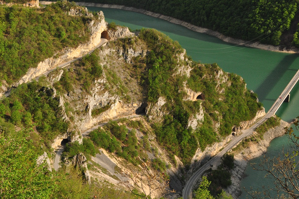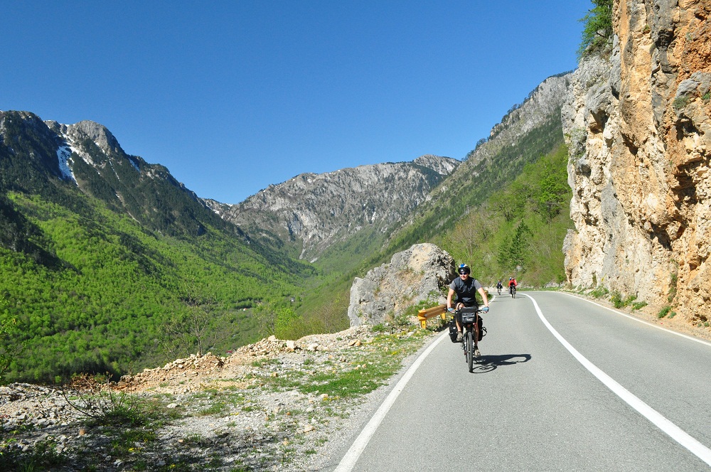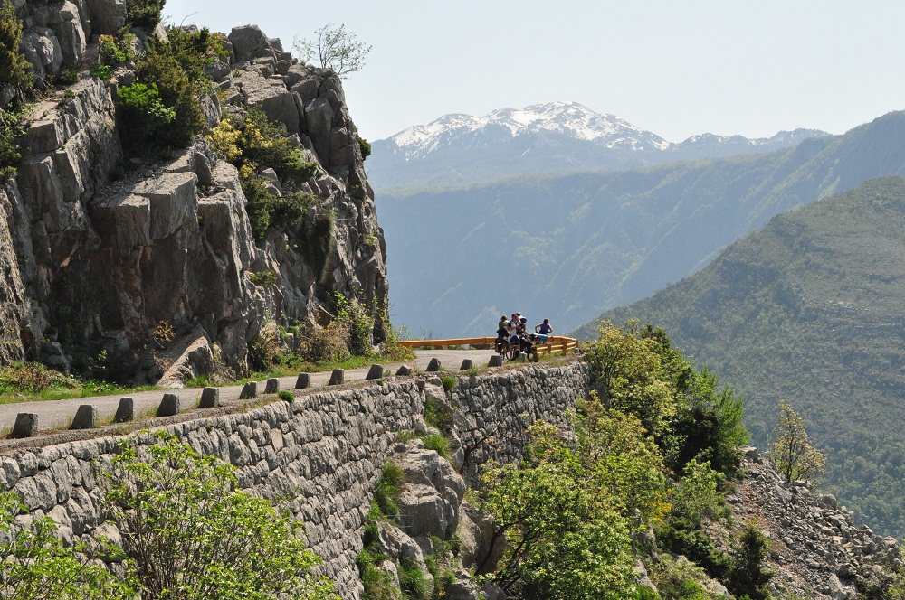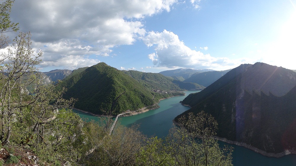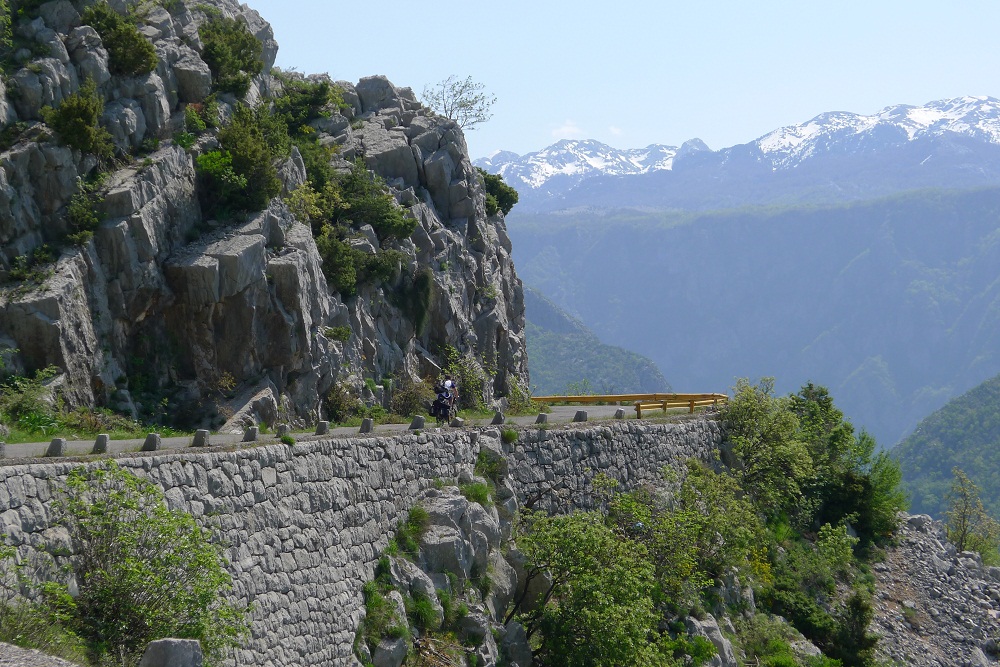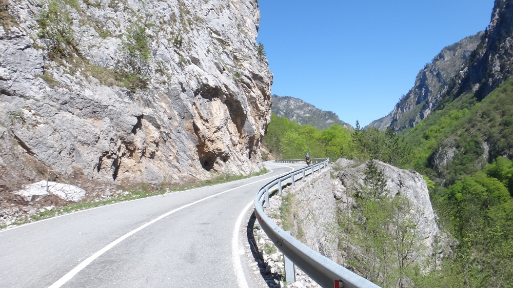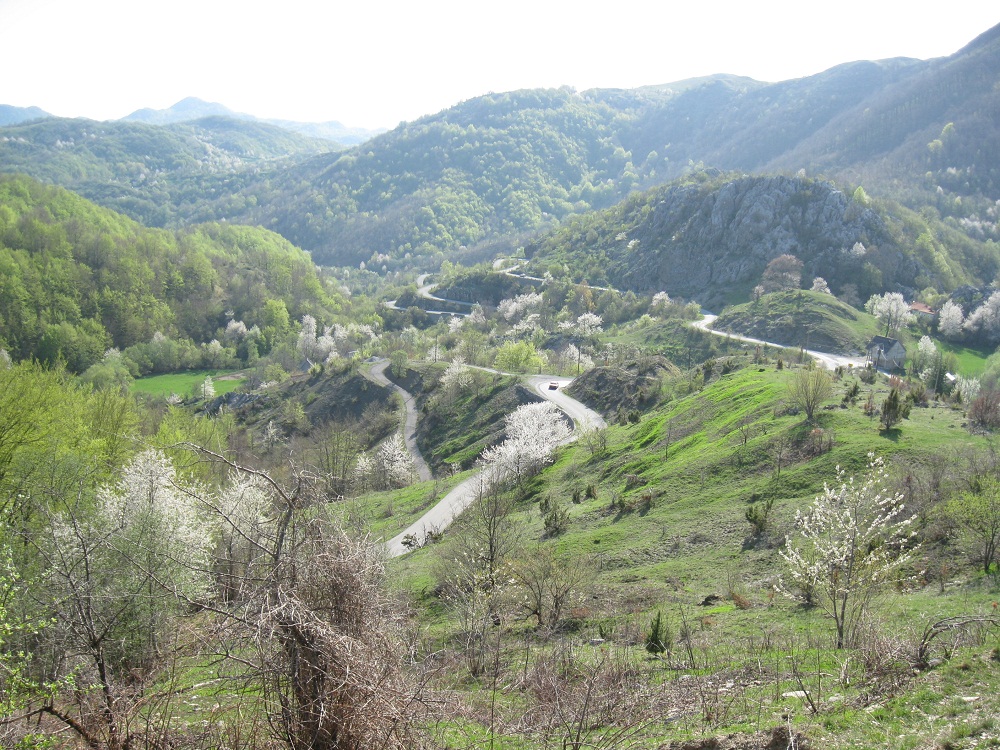 . Дорога по направлению к Никшичу вдоль красивой реки Морача радует глаз, но вскоре нам сворачивать, мы не любим ездить по основным дорогам, сегодня наш маршрут пролегает по направлению к селу Матешево, нам предстоит сложный подъем из протяженного серпантина с общим набором высоты 1360м за день. Дорога довольно пустынная, ехать приятно, наслаждаемся видами каньена реки Малариека и открывающимися по правую сторону видами на горы Проклятье.