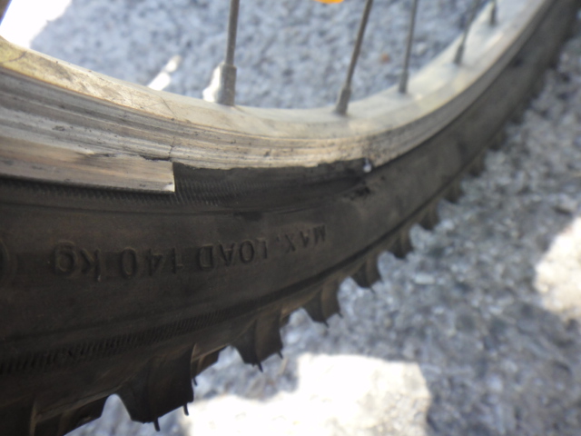 Трещина пошла вдоль обода и видно что шина может выскочить в любой момент, ехать на веле дальше рискованно и опасно особенно на спуске, хотя уверен мы бы нашли выход из ситуации. Уже появились идеи воспользоватся пластиком от бутылки как вдруг Анжела набирает номер своей подруги Лены