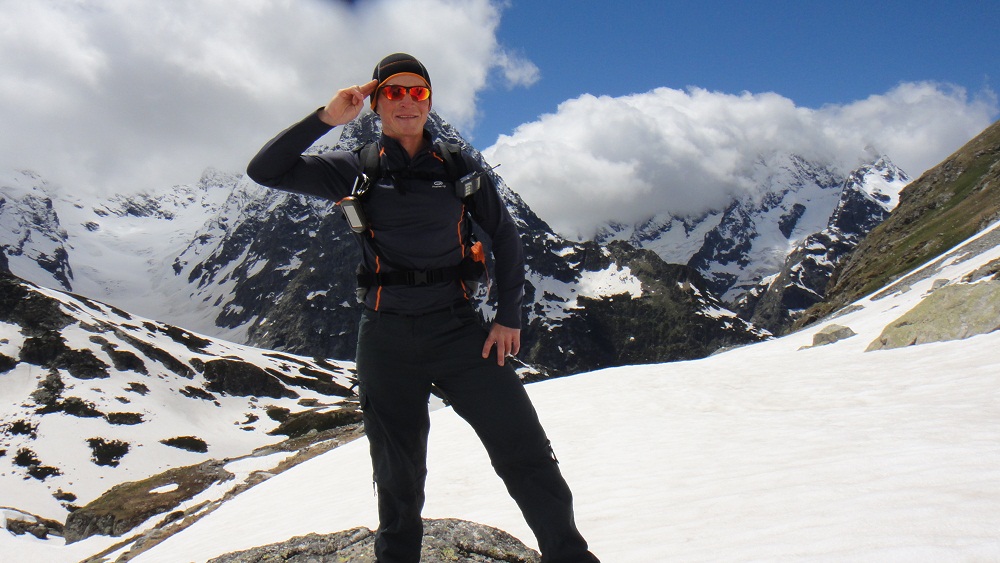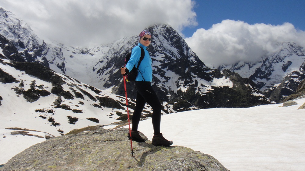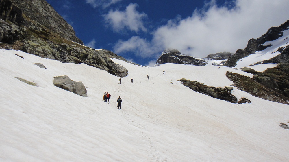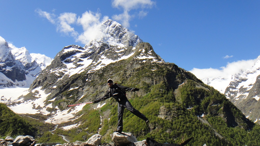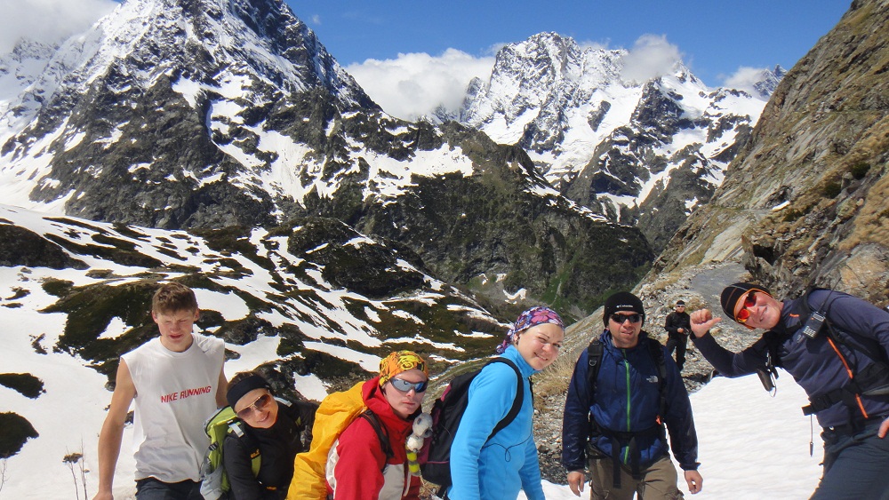 . Это зрелище было забавным. Но лишь жалко Моню, ведь он никогда не видел самочку и не знает чем она отличается от наших пацанов! После трапезы, я решил, что можно подняться к озеру Верхний Клухор, хотя нам это не разрешили! Это было 1,5 км по снежному полю и крайне крутым углом наклона, но вся группа это преодолела с достоинством. По пути я увидел след медведя, но т.к. Моня не реагировал, я решил, что это старый след. Поднявшись к озеру В.Клухор мы увидели ещё более красивые виды. Отсюда были видны 4 озера. Жаль только, что они были на 95% подо льдом. Но нам также открылся вид на ледник Клухор-Баши который величественно спускался от одноименной вершины к озеру. Это была уже высота 3000 метров. И часть группы решили остаться и любоваться там. Респект им, ведь они уже очень много прошли в условиях высокогорья без адаптационного периода. Но Я, Алик и Леха ринулись выше на лезвие хребта, откуда был вид почти на 360* и на 5-е озеро, которое я назвал 2 года назад Тайным. Т.к. у него нет официального названия!!! Там мы испытали Тебердазм от красоты. Мы устроили фотосессию на тонкой скалке под которой была пропасть около 300-4000 метров. Это было незабываемо ведь нас то окутывал туман, то вновь открывались виды. В какой-то момент Леха уронил крышку от моего фотика, она пролетела в обрыв 10 метров и остановилась на выступе. «Хрен с ней» - сказал Я, но не тут то было! Скалолаз Алик ринулся за ней не обращая внимания на мои вопли: «Не лезь туда». Блин я чуть не поседел