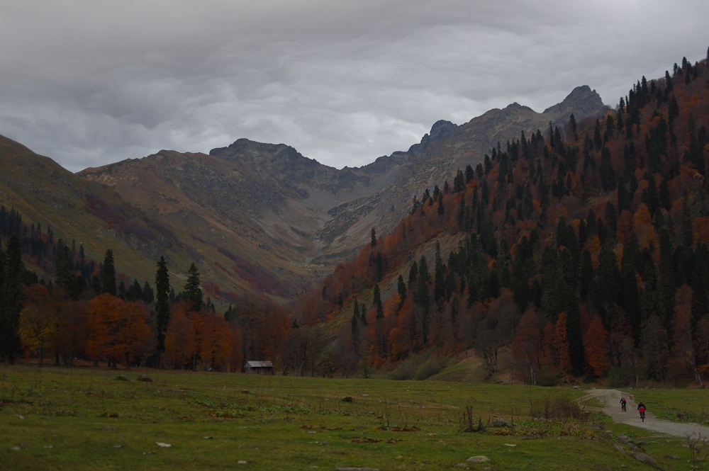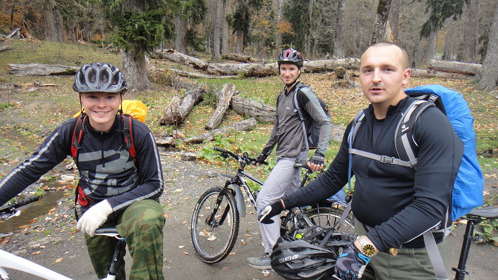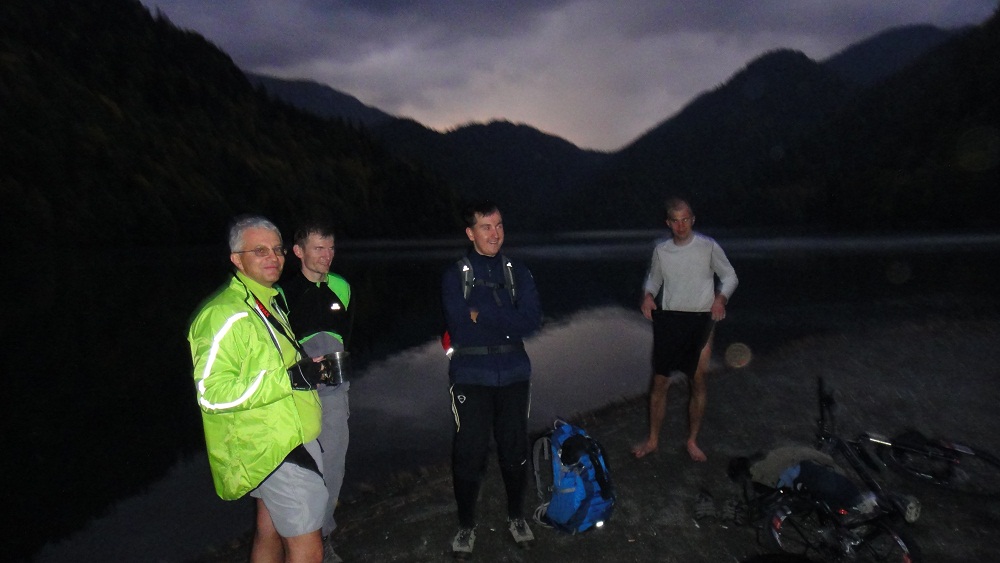 Виды по пути к озеру Мзы:Озеро Мзы:Балаган возле озера Мзы:Вся команда в сборе: Обратно добрались однако до темна. Лесники не дооценили преймущества горного велика.