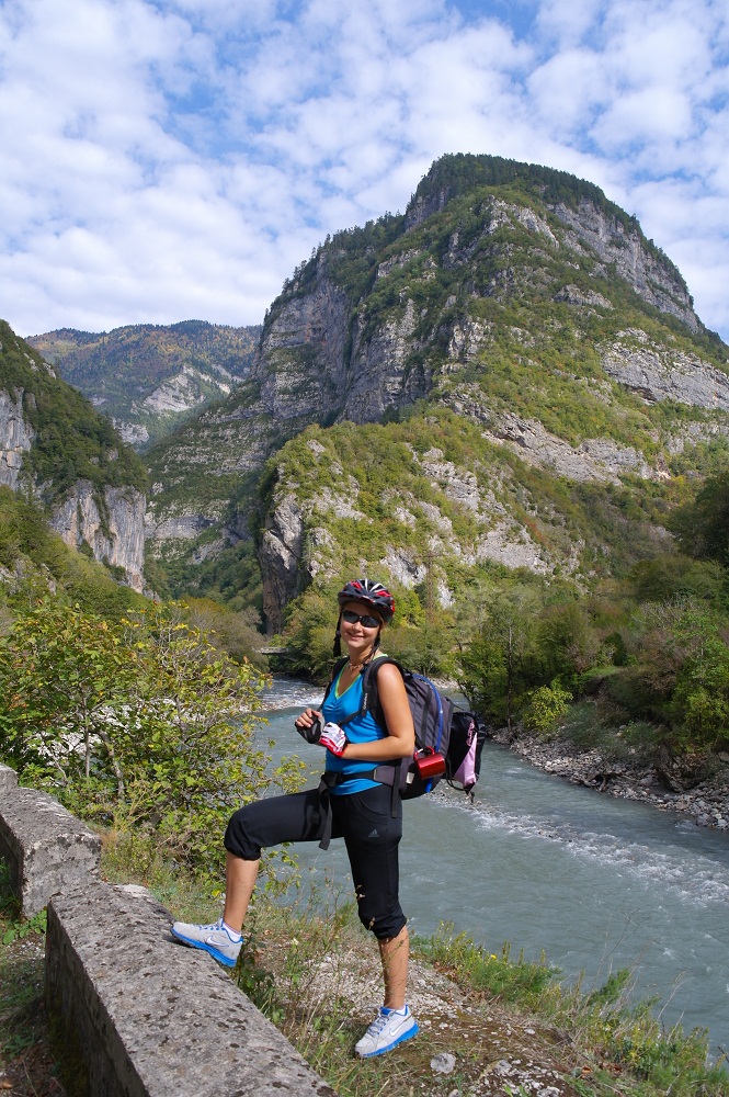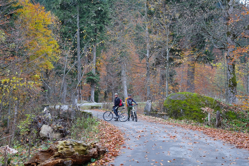Перекусили в столовой и отправились на оз.Рица. Кто был там, знает в чем прелесть проехать по каньену который ведет к озеру именно на велосипеде, окружающие горы захватывают дух. А осенние краски желто-красных деревьев в сочетании с зелеными елками и обросшими мхом деревьями придают небывалый вид летом .