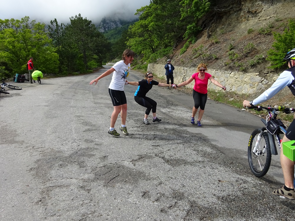 Разминувшись с группой на время ремонта встретились уже у села Морского, несмотря на крутые перевалы, этот участок был по асфальту и крутился без проблем, но дальше нам предстоял затяжной подъем на Караби-Яйлу. Плотно пообедав мы собрались духом и начиная с села Приветливого покрутили в сторону высоких гор. Местами толкая, местами помогая девочкам доползли до высоты 800м и встали на стоянку не дотянув до родника около часа пути, так как начался дождь и начинало темнеть. Проехали сегодня 44км с набором 1653м.