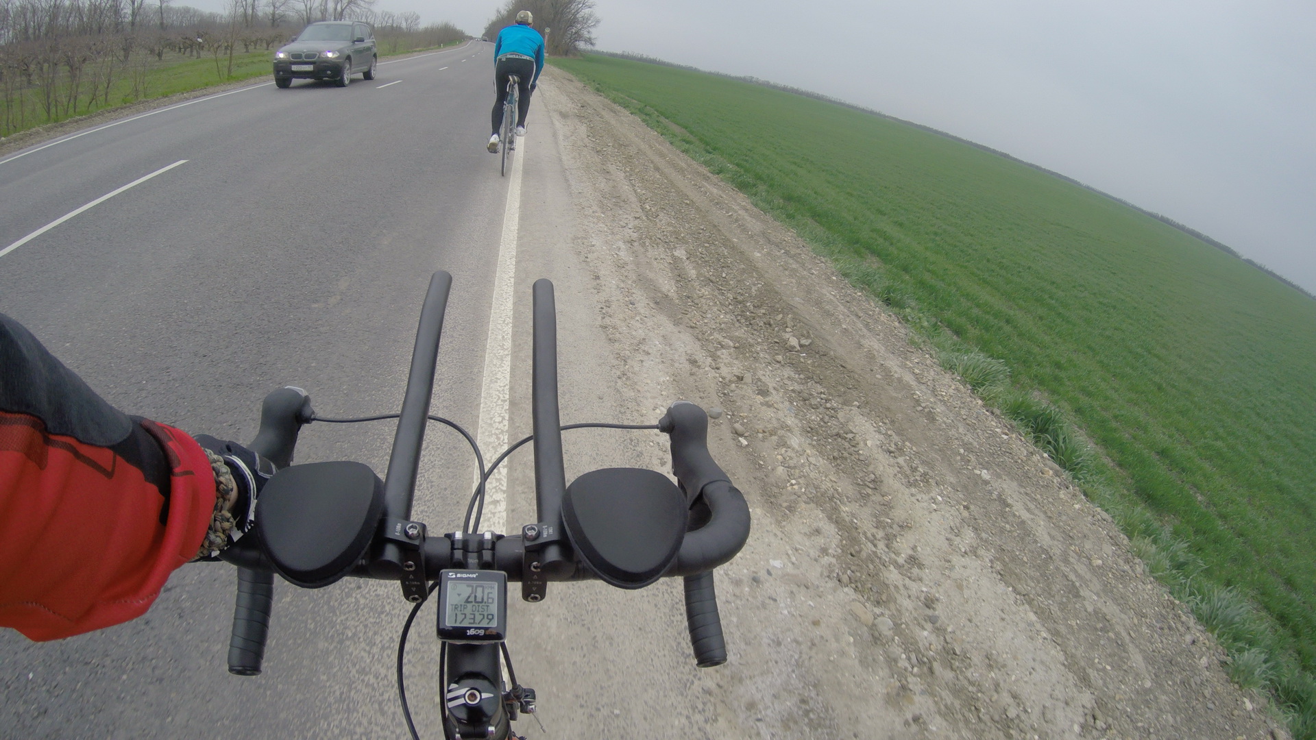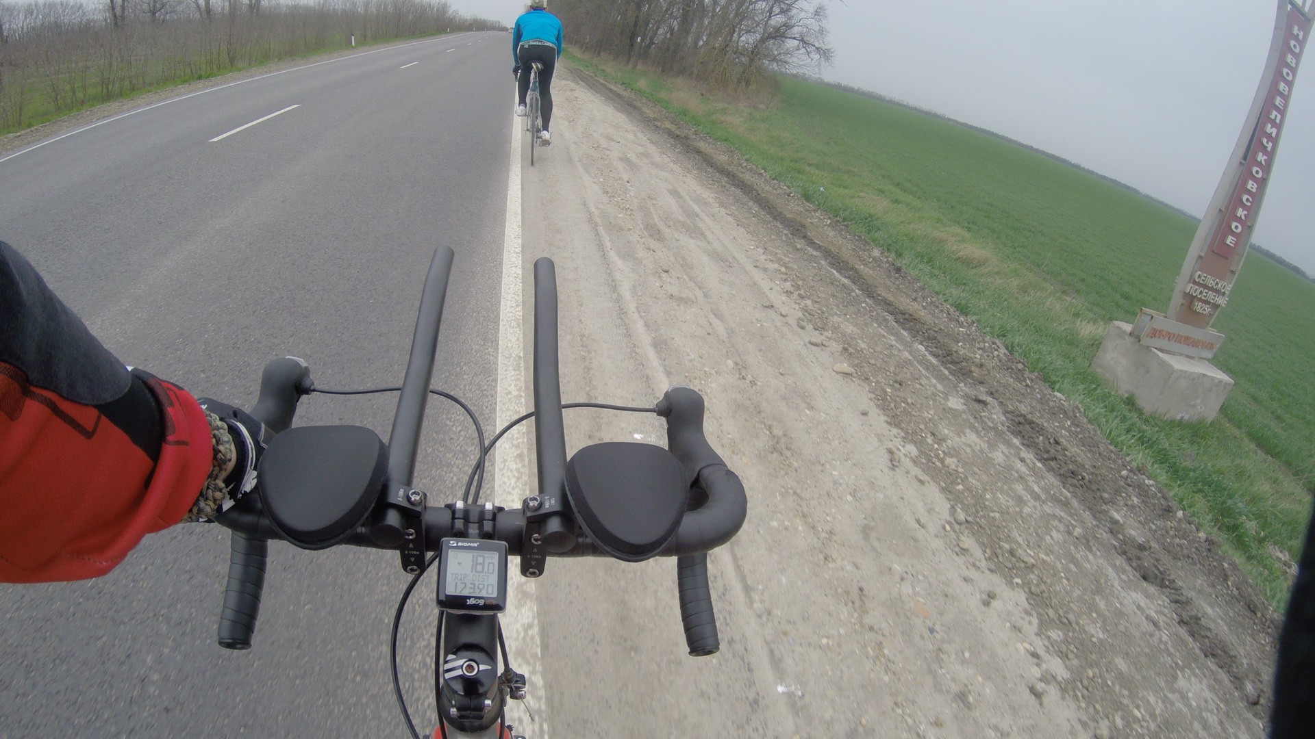 В этом году он дался проще в плане езды против ветра, к этому виду ветра я реабелитировался, но стихия сделала новый вызов с которым я ранее не сталкивался: сильный боковой ветер, как же он меня достал, малали едешь под наклоном, так ещё и скидывает на обочину, выход: в наглую ехать по центру полосы. На обратном пути после Старовеличковской появился ещё более ужасный боковый ветер, стал скидывать внезапно к центру дороги, не знаешь в такие моменты, а вдруг там окажется машина в этот миг. Средство борьбы в виде езды с боку от товарища использовались единожды: по обочине долго не протянишь, хотя и едишь в затишье и с той же скоростью, что он по асфальту.