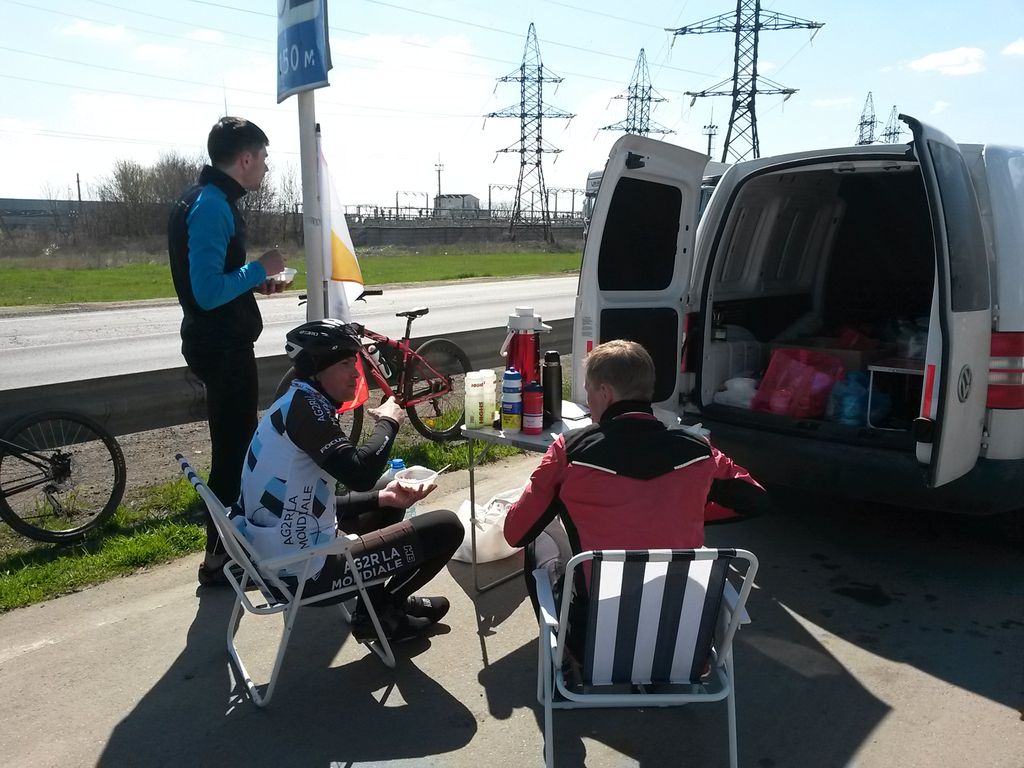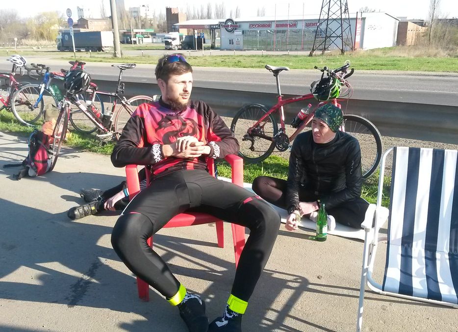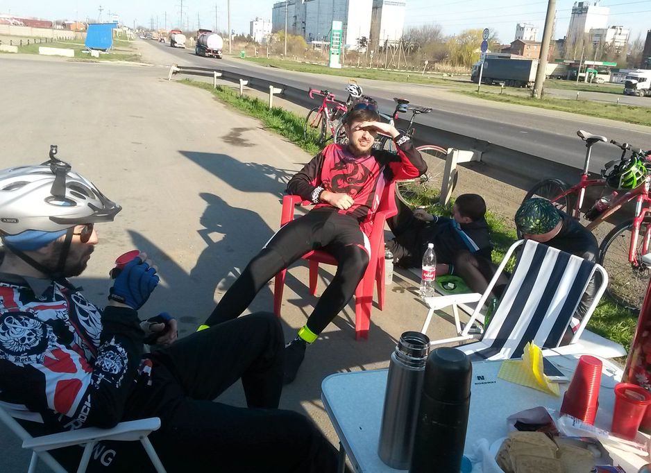 1КП Северская, долетели быстро - как то не ожидал) чуток не проскочили его, но позитивные возгласы наших волонтеров нас остановило на короткий привал. Тронулись дальше и тут на переезде выпал мой телефон из держателя и разбивает сам себе та..ло, огорчившись, подумал что хана ему - вкл. работает сорванец))) .... Починим подумал я и поехали далее. Леха немного со мной помучившись, остановился, перекинул цепь со словами: "Запарился, как вентилятор"))))... Покрутил дальше. Пытался удержаться, но кассета мне этого не позволила сделать. Отпустил его вдаль..