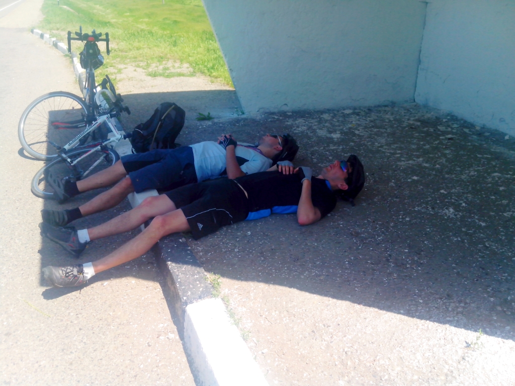 В Кропоткине заехали в кафешку (КП), выбирали по принципу «куда пустят с великом». Вы не поверите, но такие кафешки существуют! Еда там не очень понравилась, да и как то там холодно было, кондиционеры кондиционировали. Толи дело на улице, где нас по-прежнему ждало ласковое майское солнышко. Одним словом, решили оттуда поскорее убираться.