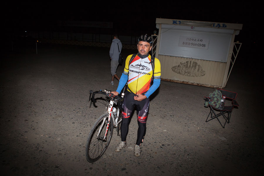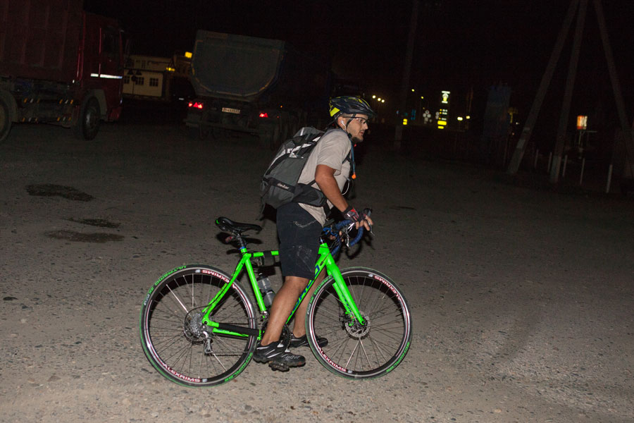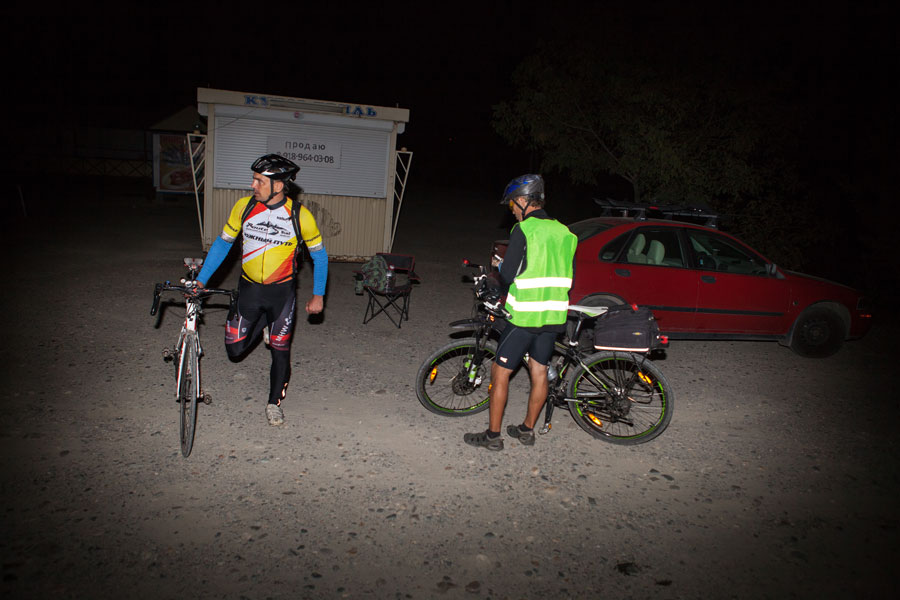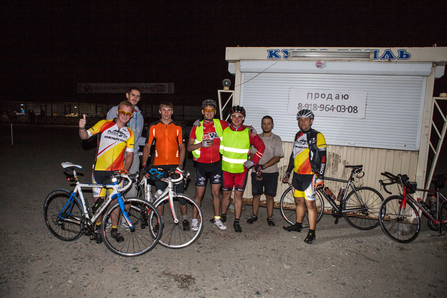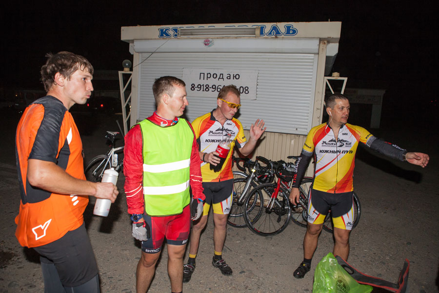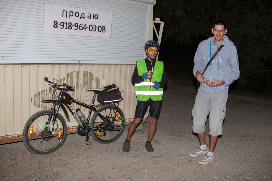 И тут же к холоду добавилось третье испытание. Я пропустил нужный поворот и поехал не туда. Когда я заподозрил что-то неладное и посмотрел на навигатор, я намотал 11 лишних километров. Ты даже не представляешь, как это тяжело возвращаться назад, отодвигать еще как минимум на час заветную встречу с волонтерами. Я уже начал думать грешным делом о том, чтобы на них и закончить свое путешествие. Но я решил обмануть самого себя, взял навигатор и проработал альтернативный маршрут, который выводил меня на волонтеров, он был чуть длинней, но в тот момент до жути не хотелось возвращаться назад. Потом пару раз пожалел об этом, когда пришлось крутить по грунтовкам в полях между хуторами на шоссере. Это тебе не твой двух подвес. У меня еще в тот момент пришла в голову мысль, что меня сейчас кто-нибудь встретит и не дай бог спросит куда я еду. Где-то в полях в два часа ночи человек на велосипеде едет в Краснодар, до которого 150 км. Хм...