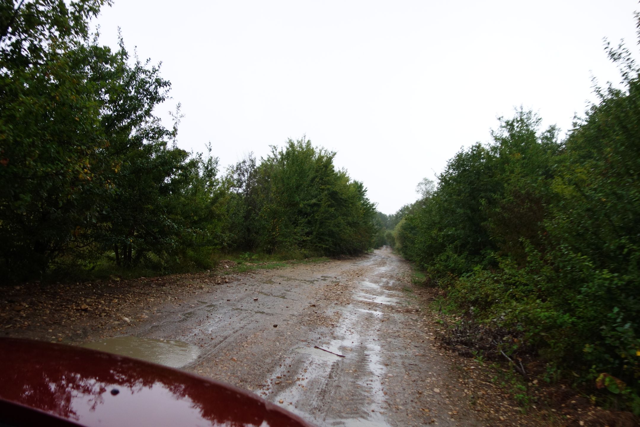 Но есть "изюминка" - с альтернативами - за Майкопом. За Курджипской до Дагестанской - отличный асфальт, который при повороте на Безводный превращается в 15км всепогодной, хорошо укатанной гравийки. Можно гравийку сократить в три раза, ибо есть альтернативный вариант трека - через Дагестанскую и Красный Дагестан, и мы его даже проехали... Там всего 5км без асфальта... Но грунтово-гравийной дороги, в паре мест условно-проезжаемой в непогоду - мы его проезжали в ливень, так что худшее состояние дороги вполне наглядно созерцали.