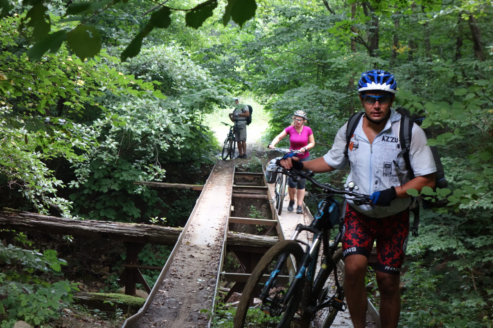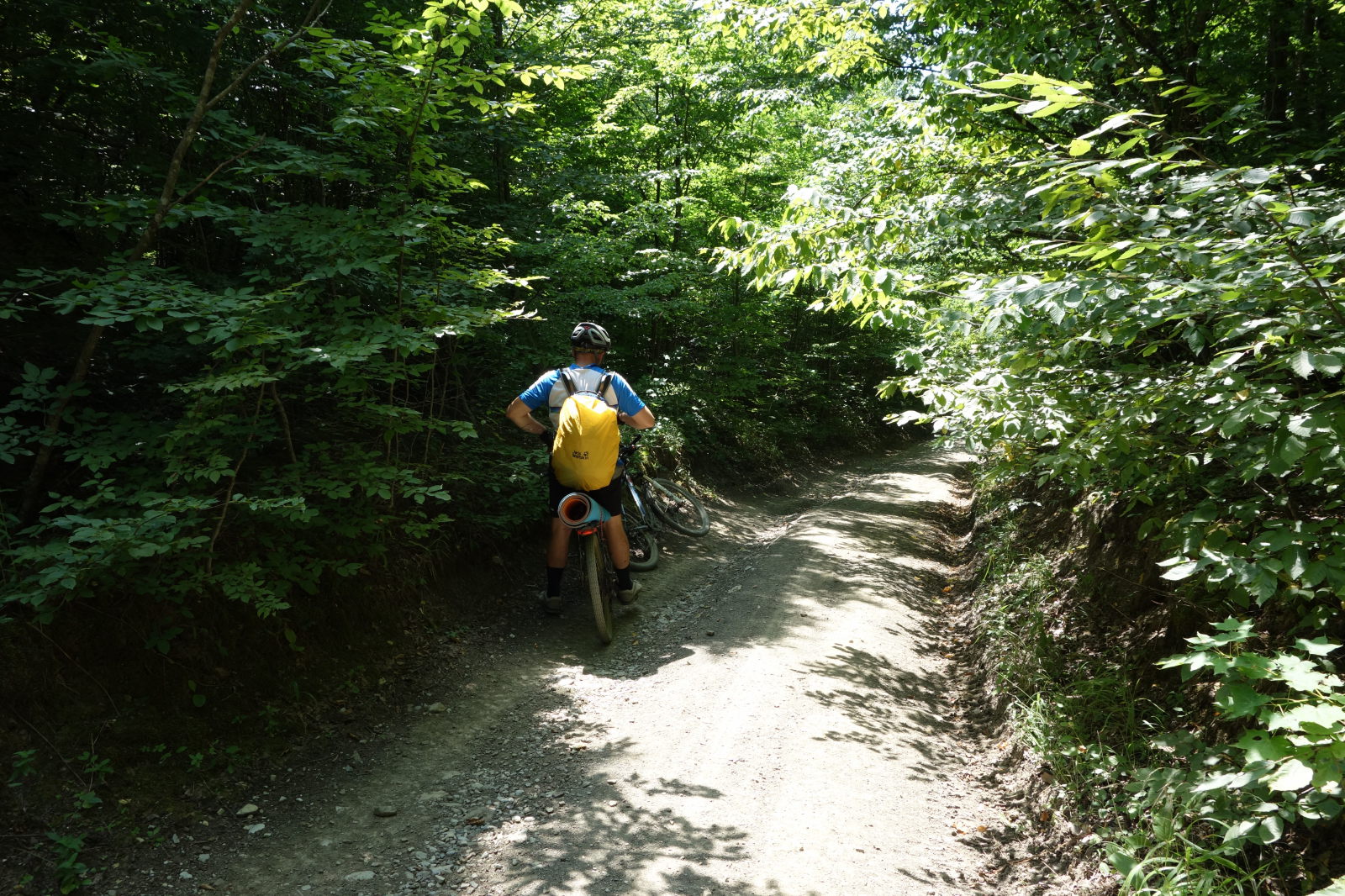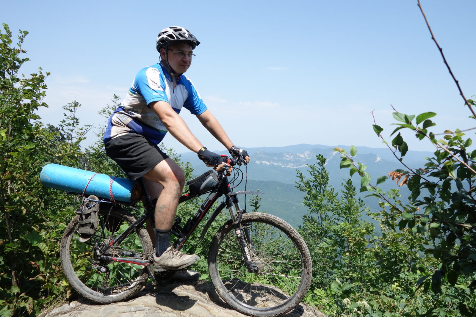 В дальнейшем пути я имел честь навернуться из-за позорной технической ошибки. На большой скорости пытался уйти от куста ежевики и сменить полосу. Физика рассказала мне о своих законах. Интересно, что шлем, вместо того чтобы защитить, съехал набок - и в результате у меня погнулась дужка очков. Также порвался проводок велокомпьютера, и я более не мог снимать показания с этого замечательного похода. Несмотря на это, я совершенно уверен, что проехал не менее 100500 км маршрута!!