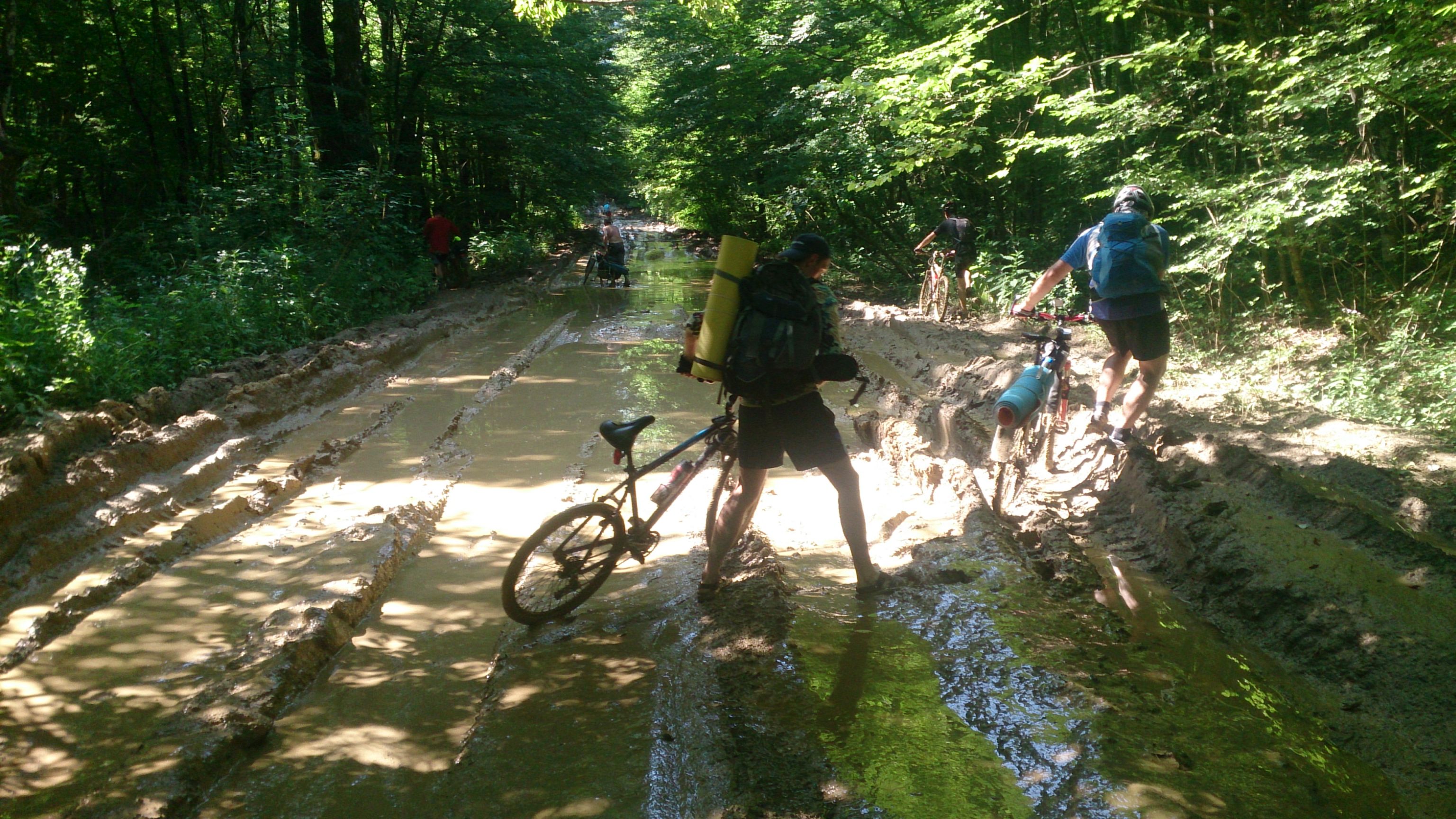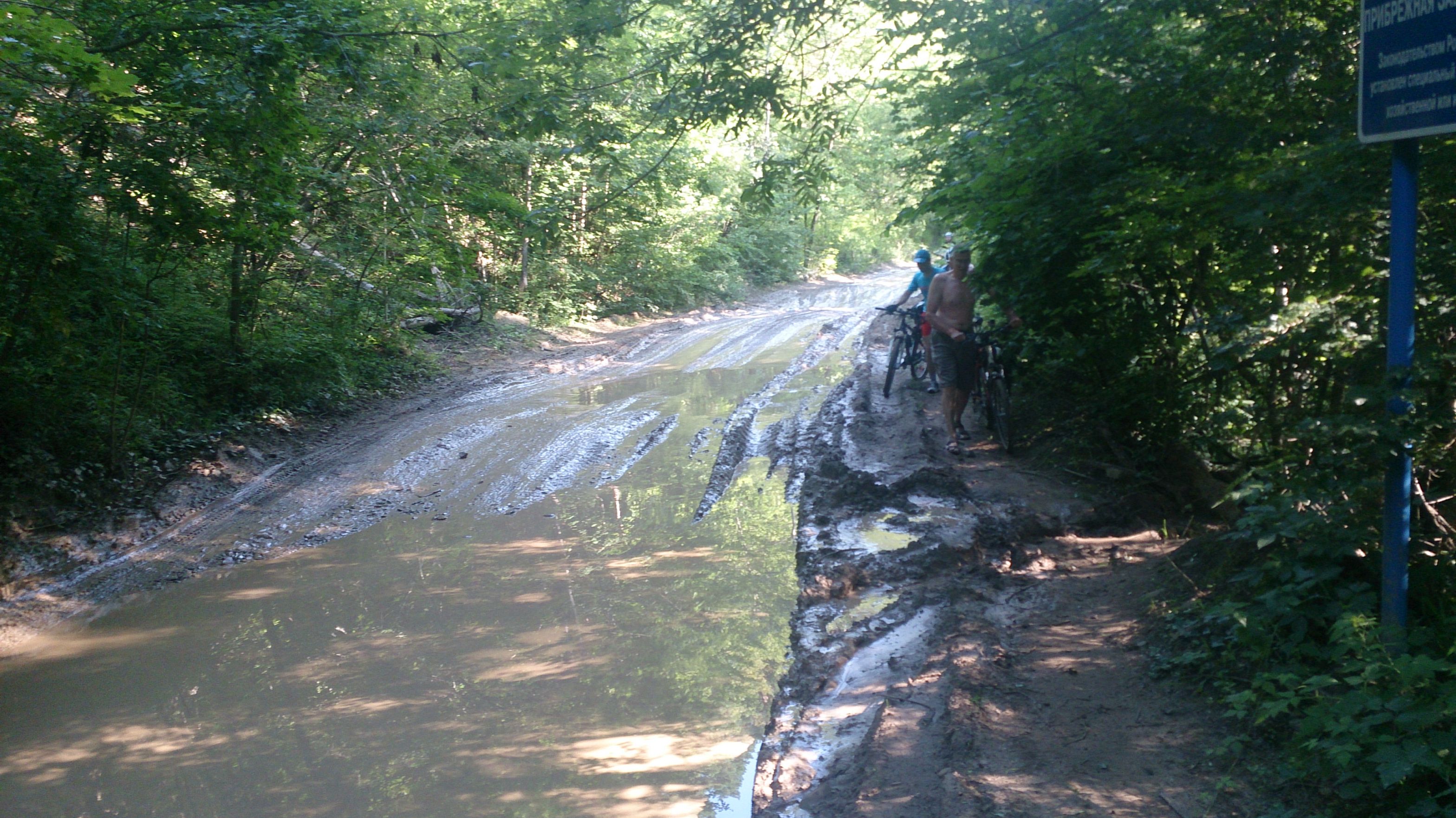 Налюбовавшись на красоту, поехали уже с Joz в авангарде. Соответственно, первыми же приняли на себя удар от маршрута - качественные, бескрайние скопища грязи :no2: Из всех сил надеясь на улучшение дороги, изначально обходили и проносили свои вело окольными путями ... поняв через пару километров всю тщетность наших потуг, Joz предложил втапливать прямо по лужам. Ну я и согласился :vava: