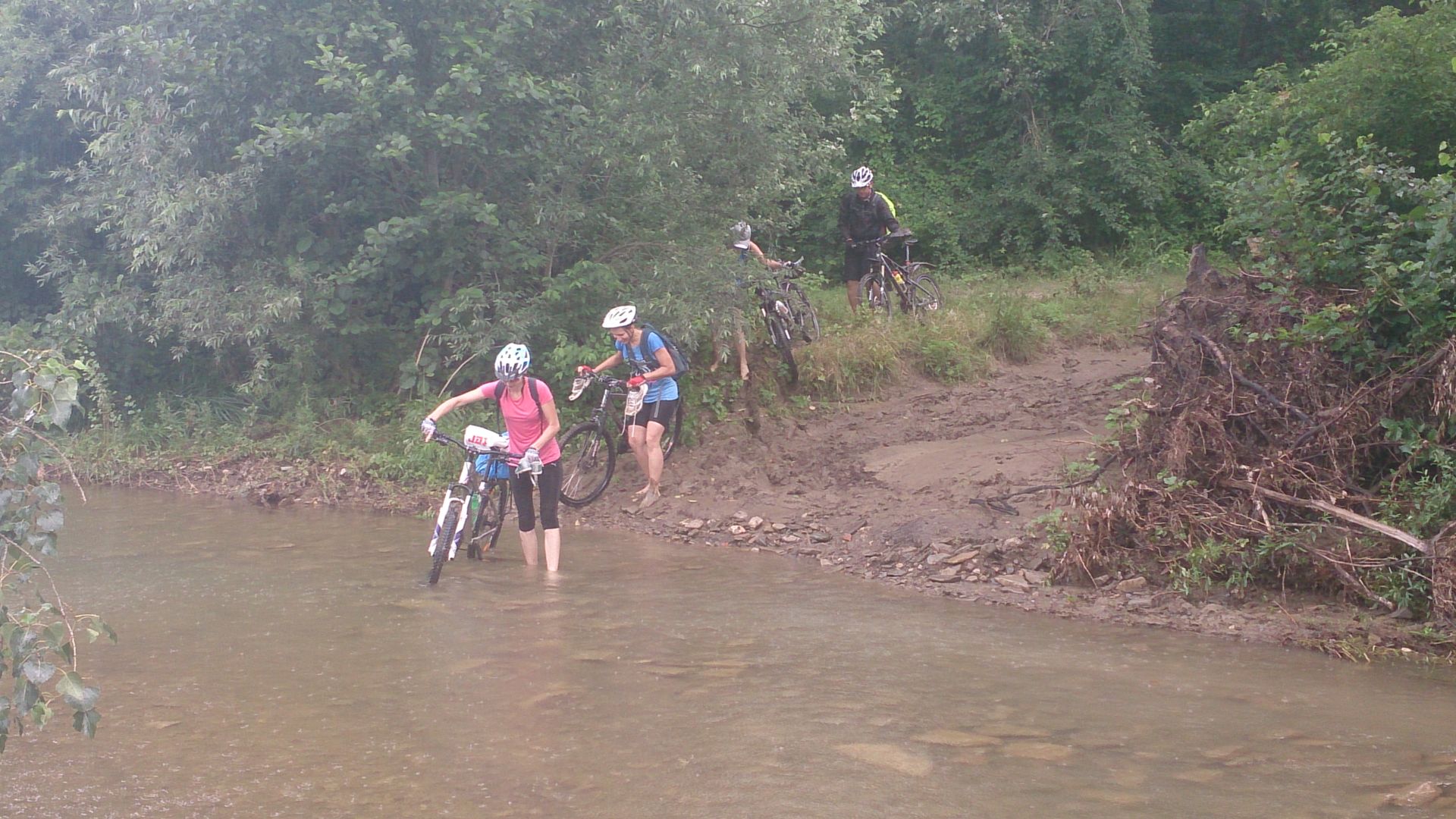 Друзья, спасибо всем за отличную позитивную компанию, которая верит только в хорошие метеопрогнозы! Поездка выдалась отличная и богатая на разнообразные впечатления: езда по трассе сменялась спокойными поселковыми дорогами, плавно переходящими в "газпромовскую трассу", рельеф и подъёмы которой свидетельствовали о том, как тяжело быть "газпромовцем"))). Лесная велотрасса "Кабанья" так нам и не покорилась, потому что погода тоже была контрастной, и к моменту нашего прибытия к ней, из-за постоянных дождиков, она стала невероятно скользкой и проходимой разве что для диких кабанов, но не для велолосей)))) Собрав последние силы, пришлось давать круг в обход и, не без удовольствия, форсировав реку, мы прибыли к месту нашего привала. Несмотря на то, что в купании особой необходимости не было, так как всю дорогу каждый участник был выкупан и не раз, большинство приняло решение искупаться в горной речке. И это было чудесно, полная гармония и единение с природой:снизу вода и сверху тоже льётся целительная влага)) Каждый дождик тут же сменялся солнцем, а наши испытания сменились настоящим банкетом в честь именинника Саши Gemini, который позаботился о восстановлении наших сил. Под проливным дождём мы чествовали Сашу, а дождь тут же наполнял наши бокалы и чашки с едой доверху, ну разве не чудо: бокал наполнен на 1\3, а через несколько секунд уже полон?))) Это вам не в ресторане))), природа явно нам благоволила))) Подкрепившись и восстановив силы, мы отправились в обратный путь уже по практически ровной дороге без всякой "газпромовщины")).Хорошая погодка сопровождала нас до самого Краснодара. Чудесная компания, чудесное настроение, хорошая нагрузка ( у меня 110км)) и эмоциональная разрядка! Алик спасибо, что провёл нас по отличному маршруту, всем ребятам за стойкость и моральную устойчивость)), а Свете за мужество!))