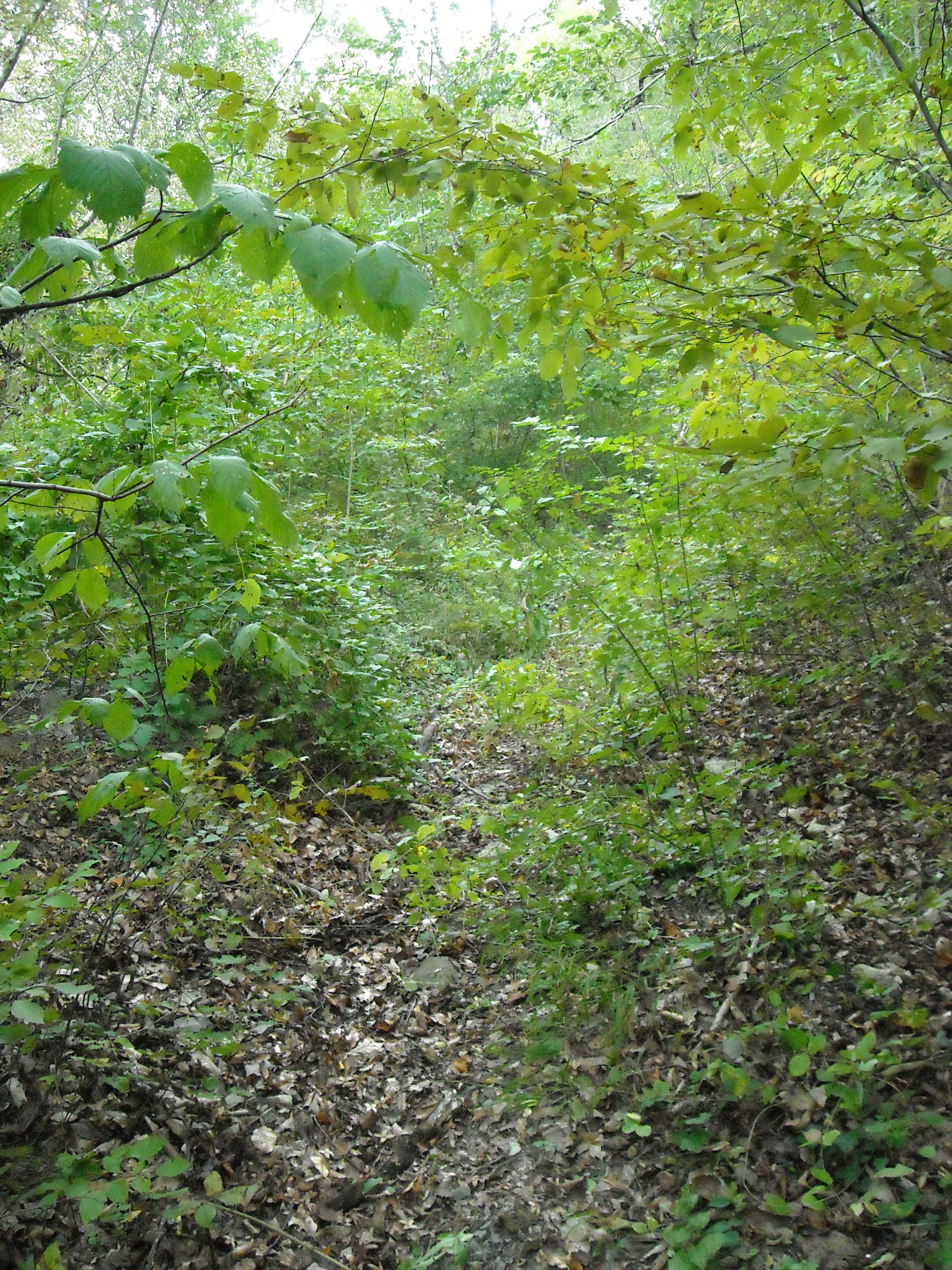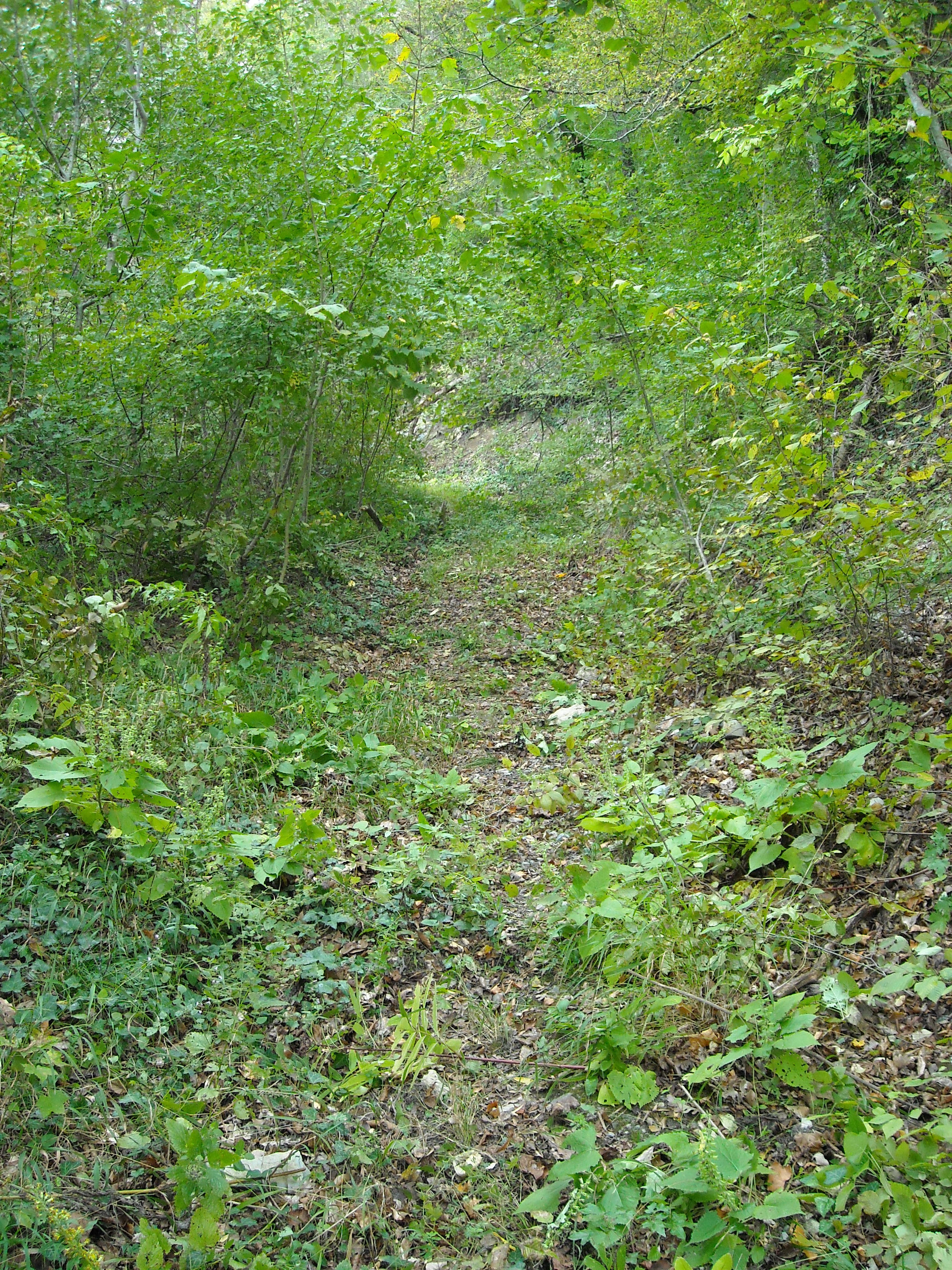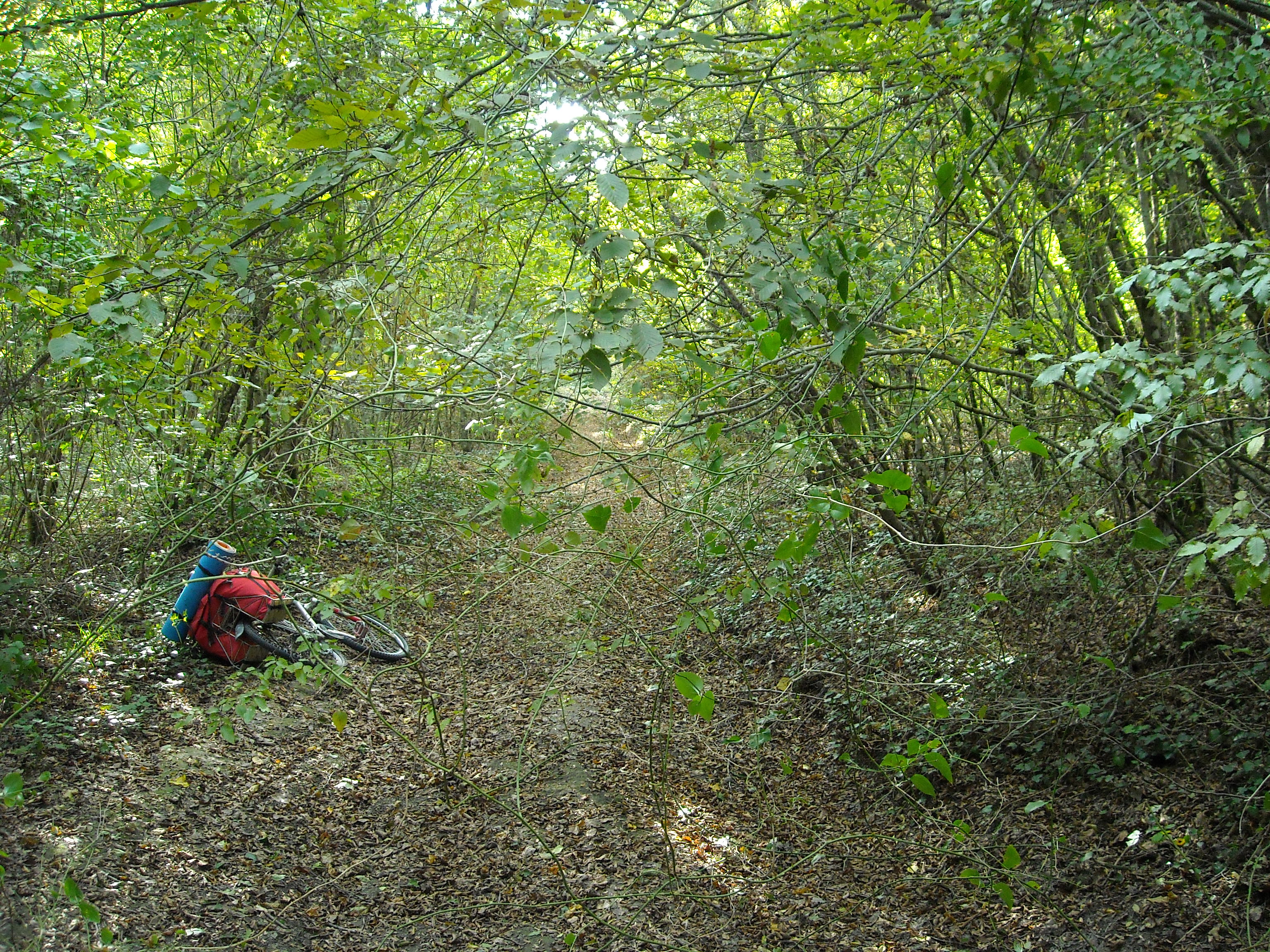 Далее идёт на подъём 3км и спуск к Прасковейке - 5км в районе Мегафышки. Старый путь давно брошен. Первые 1.5км продирался пару часов, проделав пару лазов под деревьями. Далее легче, ту часть дороги бросили позже, использовали лесогубы мотаясь за буком почти к Колбасиновой, там примерно кило до высоты 368м. Но пробраться неудалось. Сел клеится - три латки да и покрышки внушили опасения. Развернулся. Менее 10мин и я на дороге. Спустился в Прасковейку, заныкал ножовку под той елью(см. фото).
