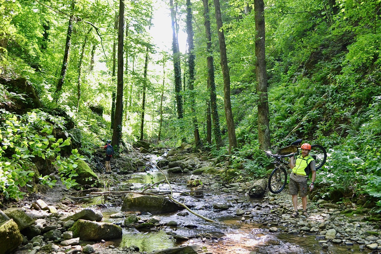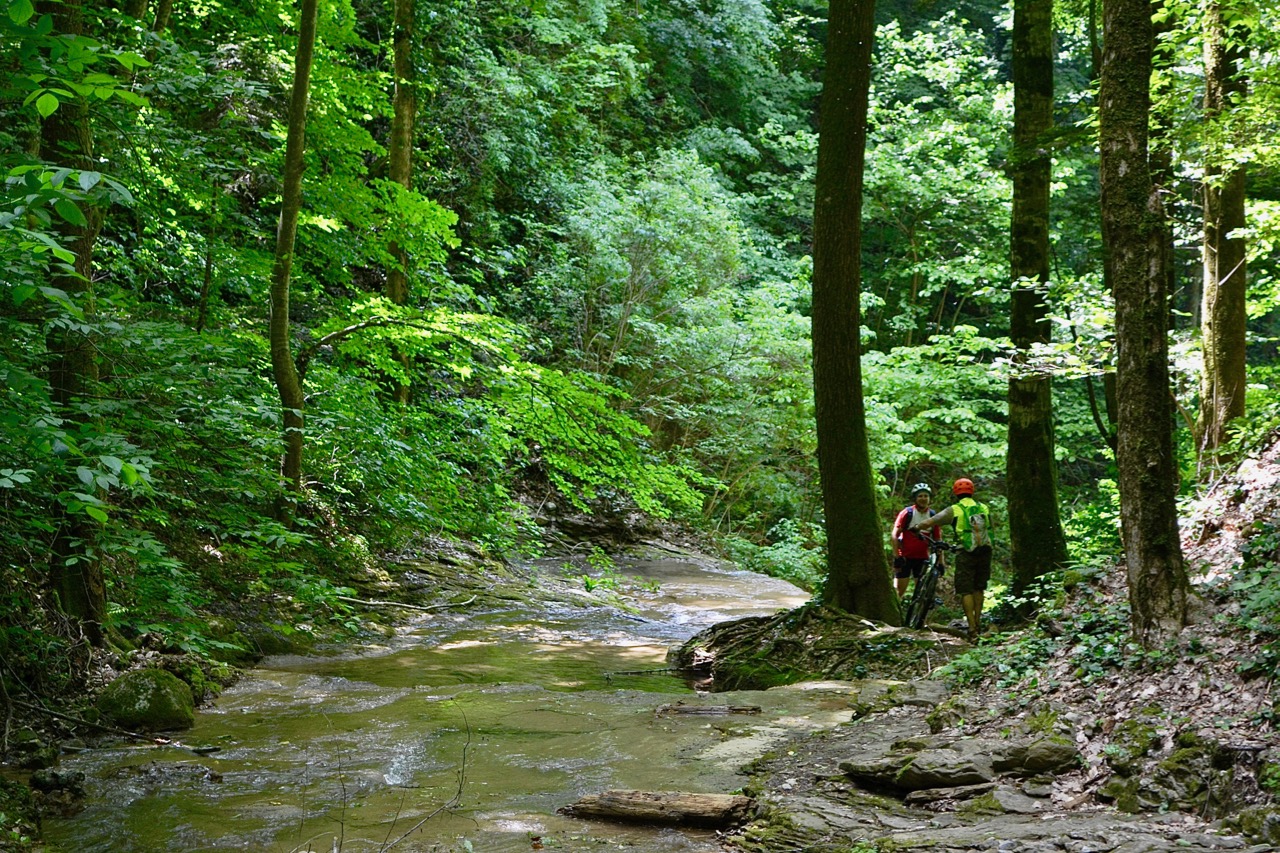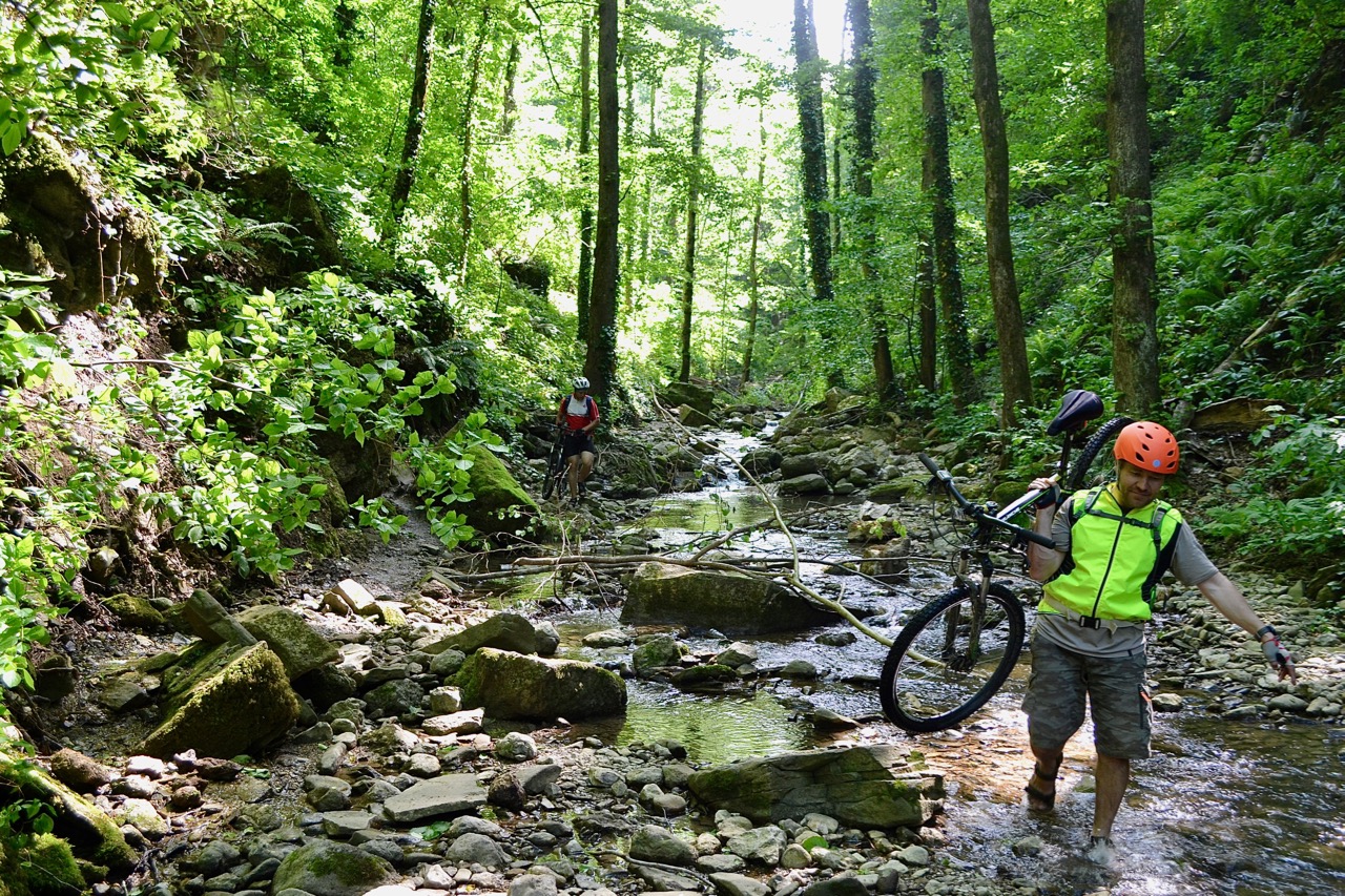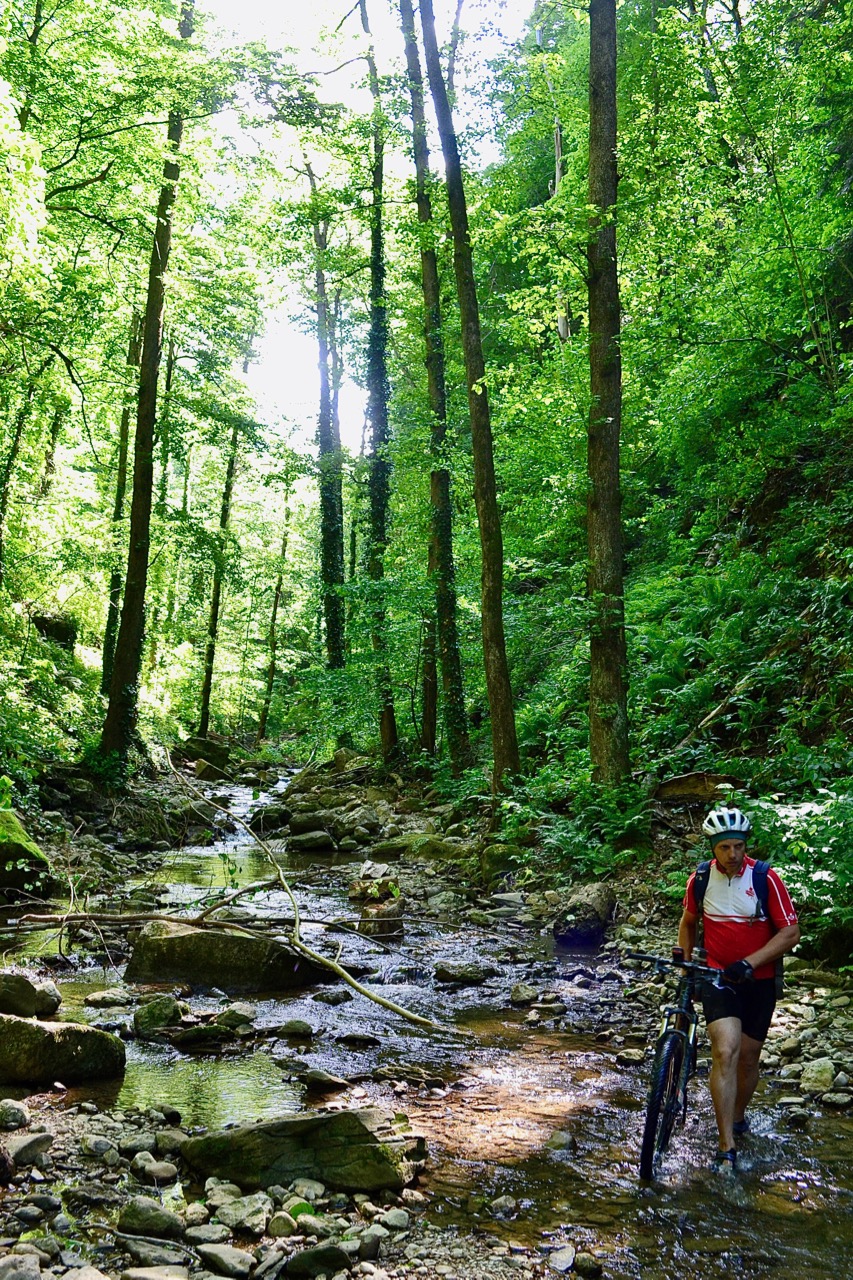 За спиной у меня трехгодичный опыт загородных покатушек, велотуризма, соревок и марафонов, но Краснодарские горы вкупе с R2-D2 показали мне новый уровень каталки )) Первая часть пути была спокойной, колеи, грязи, в целом все проезжаемо. А потом... чем дальше в лес, тем больше дров ))) Возвращаться и искать нужный поворот не хотелось, единогласно решили пройти лесом. "Всего-то метров 500, конечно пройдем". Лес оказался с характером. Не пойми от куда внезапно появляющиеся ветки цеплялись за вел, царапали ноги, я спотыкалась и чуть не раскладывалась много-много раз. Но! Там было хорошо, тихо, красиво... Были и огромные поваленный бревна, и "пологие" по словам Димы подъемы. Оооо, это отдельная песня. Когда нужно было пройти через лесную впадину, Дима обычно говорил: "Пойдем тут, тут поположе". Смотрю прямо, влево, вправо, в общем-то вижу одну и туже засаду: практически отвесный подъем, смотрю на своего коня: И что ж ты у меня летать не умеешь?