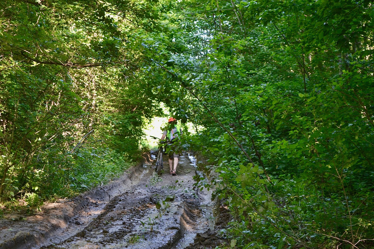 Где-то на этом трэшовом участке я потеряла поилку, а выбить ее из флягодержателя задача не из простых... На последних км вел периодически превращался в фет, блокировались колеса и приходилось вычищать забившуюся грязь, обходы уже не искала, тупо шлепала по грязи получая удовольствие )) Я хз как там передвигаться будь грязь не такой жидкой...