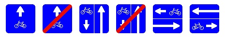 По порядку слева на право: Знак 5.14.2 Полоса для велосипедистов Знак 5.14.3 Конец полосы для велосипедистов Знак 5.11.2 Дорога с полосой для велосипедистов Знак 5.12.2 Конец дороги с полосой для велосипедистов Знак 5.13.3 Выезд на дорогу с полосой для велосипедистов Знак 5.13.4 Выезд на дорогу с полосой для велосипедистов