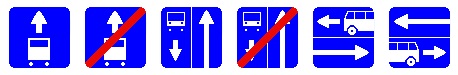 По порядку слева на право: Знак 5.14 Полоса для маршрутных транспортных средств Знак 5.14.1 Конец полосы для маршрутных транспортных средств Знак 5.11.1 Дорога с полосой для маршрутных транспортных средств Знак 5.12.1 Конец дороги с полосой для маршрутных транспортных средств Знак 5.13.1 Выезд на дорогу с полосой для маршрутных транспортных средств Знак 5.13.2 Выезд на дорогу с полосой для маршрутных транспортных средств