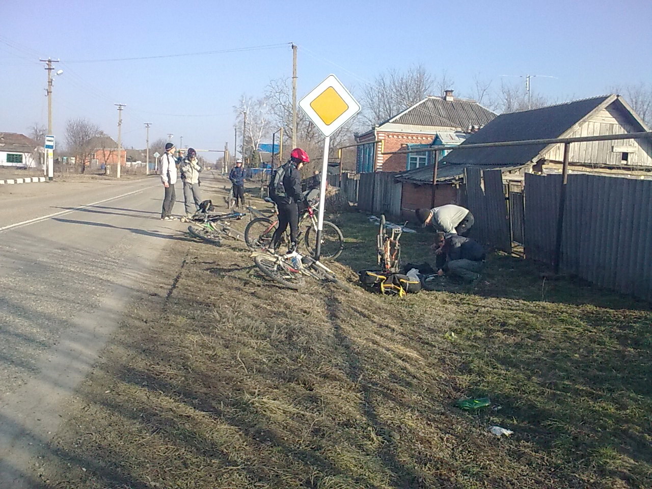 Жаль - прокололся, а накачать не смогли - обод высокий, насос ниппель не прихватывал. Километров 6-7 пешком шёл, а по асфальту на спущенном потихоньку поехал, навстречу велоносцу.