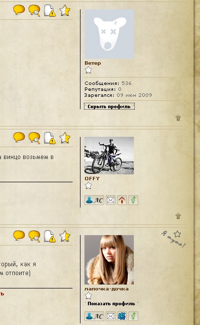 Активную тему добавлю, уже говорил. А профиль останется скрыт, т.к. у пользователя, при обильно заполненном профиле, сообщение из 1-2 слов смотрится слишком вытянутым, а так компактнее. Надо посмотреть - открыл.