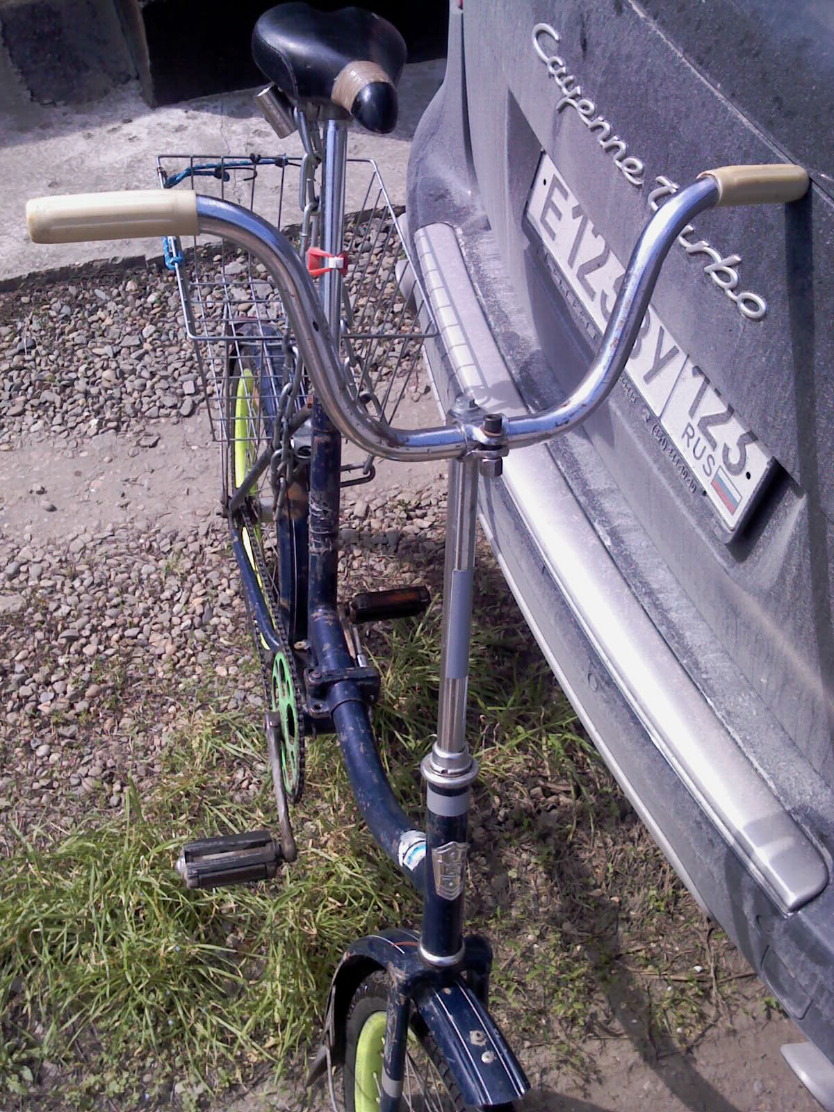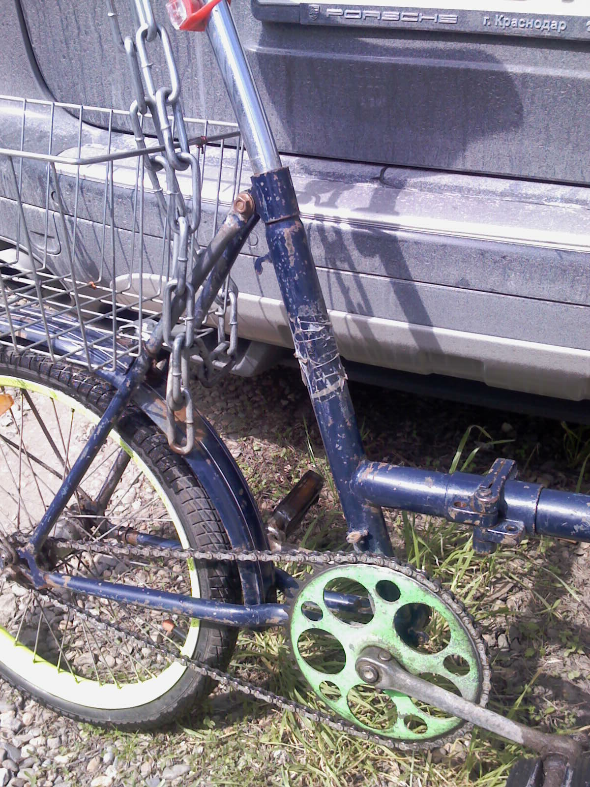 Рамку и вилку ободрал от краски и ржавчины ,загрунтовал и покрасил яркими флоурисцентными красками ,узлы перебрал ,смазал ,допилил .Прикрутил корзинку , громкий сигнал и засветился на нём на (выздоравливай комрад).