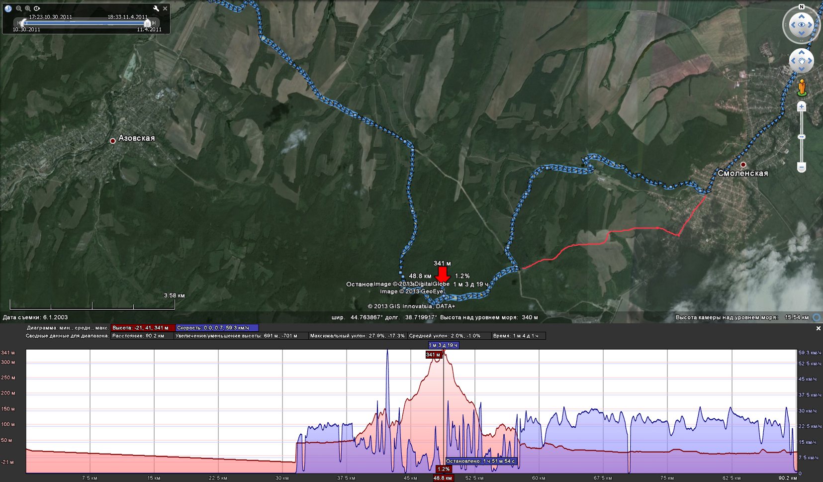 От Смоленской по асфальту до Краснодара. Маршрут относительно не сложный. Километраж выходит около 60-65км в основном за счет асфальта.