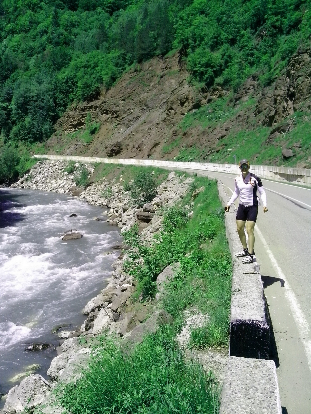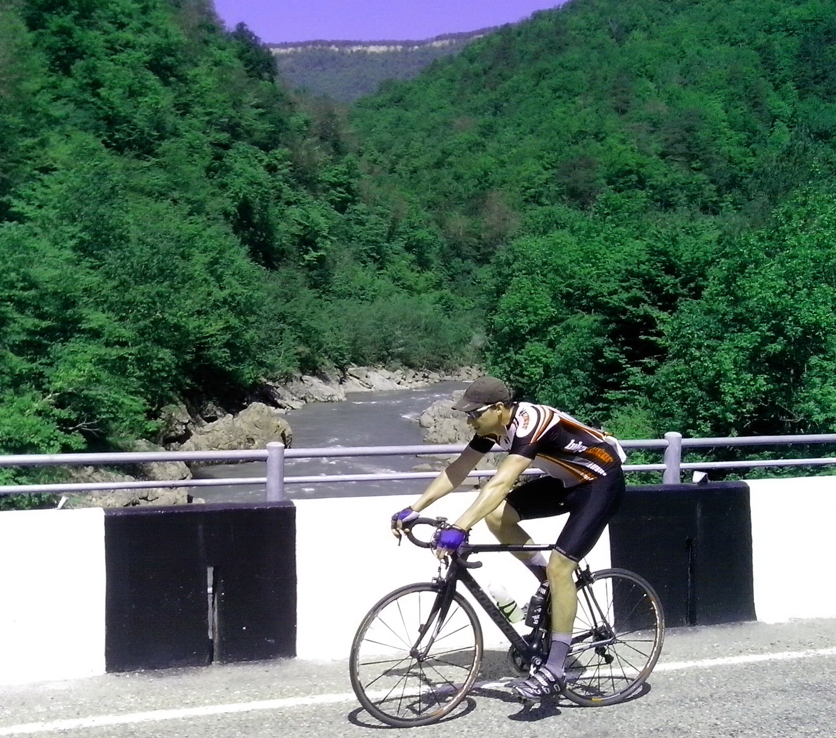 Поездка получилась насыщенной. Стартанули после 10 из Хаджоха, в ущелье ощущалась приятная прохлада. Любуясь окресностями, не торопясь доехали до Гузерипля. Здесь началась основная часть тренировки - подъем на Партизанку. Наверх ехал не останавливаясь, оставив фотосессии на спуск, и 17км подъема преодолел за 1ч11м, отстав на 2мин от лидера нашей группы. Высота 1700м, сидим, ждем Сергея... Он подъехал через 40 мин и сразу начался дождь, переходящий в град. Сидим втроем под навесиком у продавцов фиточая, дегустируем... Минут 40 пережидали то дождь то град, но он не кончался, холодало, решили спускаться под дождем. Это жесть. У меня и Вадика были легкие ветровки, а вот Серега ехал в майке и нарукавниках. От холода он орал нечеловеческим голосом. Минут через 15 спуска дождь закончился, пошла сухая дорога и долгожданное тепло.