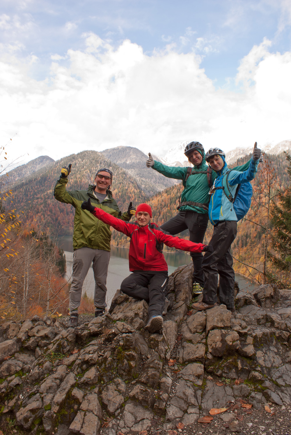 Прокатившись вдоль озера, посмотрели на него сверху, фото на память, аватарки… Вода в нем – красивая бирюзовая, на фото этого цвета не видно.. Затем спускаемся вниз к даче Сталина. Андрей впереди, мы с Наташей за ним. Мокрые листья на мокром асфальте, скорость, поворот, из-за поворота машина навстречу, тормоза, и Андрей летит через руль на обочину, без шлема, головой об камни. Напугал нас здорово. К счастью, все обошлось благополучно –несколько минут без сознания, несколько швов в больнице в Гаграх, утром перевязка там же, следующие перевязки делала Наташа… Вика сопровождала больного, добрые местные люди отвезли их вместе с великами в больницу, Макс сопровождал меня и Наташу, а вечером все встретились в том же теплом доме в Гаграх, где в саду растут хурма и мандарины, после ужина пили чачу с мандариновым соком, рыжий пес был рад безумно нашему возвращению, мы были рады, что с Андреем все в порядке, и путешествие наше продолжилось!