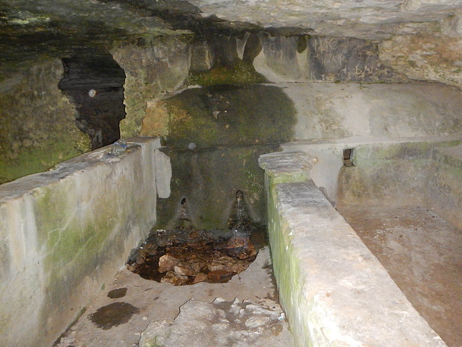 В сам накопитель вода поступает по искусственному желобу в пещере - видимо, чтобы собирать всю воду, когда ее мало в источнике. Ну, а когда воды много, она идет и по полу пещеры.