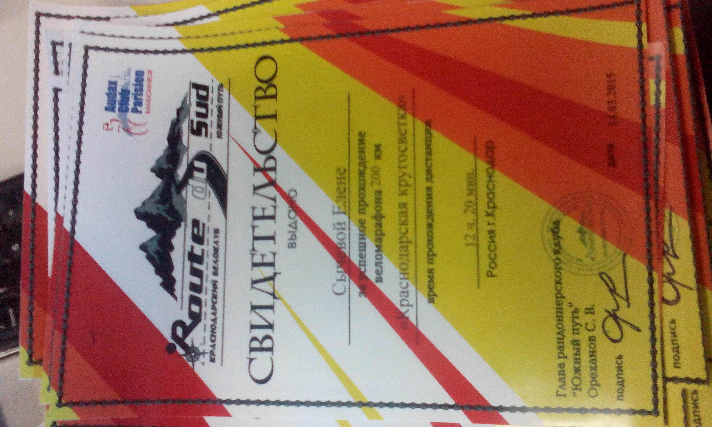Бронзовый крест Велокубани (1) Медаль "Бревет 200км" (2) Медаль "Бревет 300км" (2) Медаль "Бревет 400км" (1) Медаль "Бревет 600км" (1)