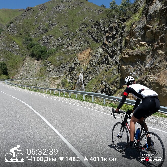 Спустились в Долину Нарзанов. Это прекрасное место отвратительно пахло жжёными колодками и сцеплением. Попили водички у источника, полезли выше. Всё ждали обещанных стен с градиентом под 20%, но больше 15% Гармин ни разу не показал. Ну и ладно, не больно-то и хотелось. На передаче 34-32 всё выкручивалось. Скорость была низкой, но размеренной. Этот подъём был довольно долгим и тяжелым. У его вершины я встретил Максима, который уже некоторое время ждал, пока я доползу. Там он предложил развернуться и поехать назад. До Джилы Су было ещё около 25 км и два подъёма в одну сторону. Ай-яй-яй. А как же план на лето? Приехать и не доехать? Не бывать этому! С такими мыслями и доползал к вершине. Однако в процессе заметил два неприятных момента: пульс колебался в районе 170 – 175 ударов, что на 10 ударов больше, чем в предыдущие подъёмы, а температура была уже 35 градусов, хотя не было ещё и 11 часов.