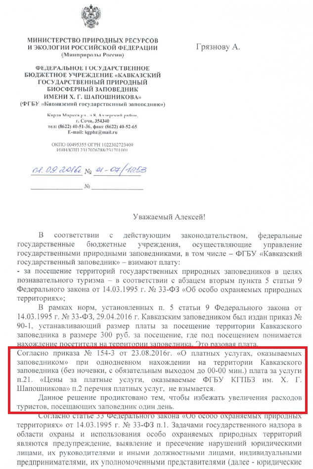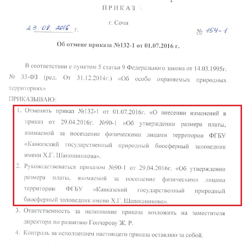 Ранее, в соц. сетях публиковался приказ №132-1 от 01.07.2016, согласно которому, было установлено бесплатное посещение Заповедника. Однако, позднее-23.08.2016 данный приказ был отменен приказом №154-1, в котором говорится о том, что взимание платы осуществляется на основании приказа №90-1 и остается равным 300 р с лиц старше 14 лет.