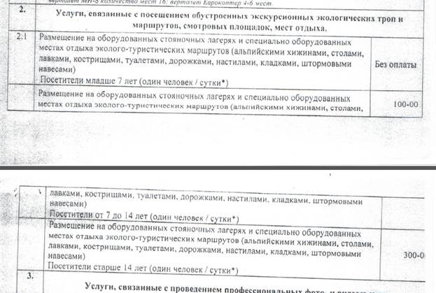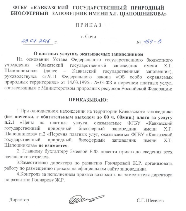 Согласно пункту 1 приказа №154-3 от 23.08.2016 о платных услугах, оказываемых заповедником: