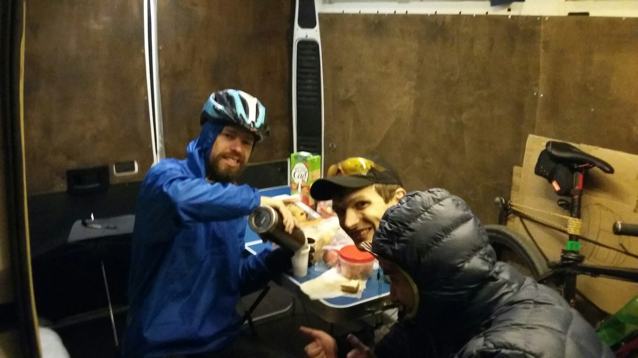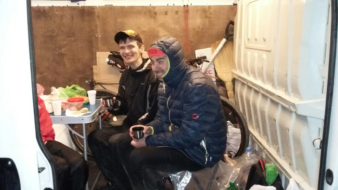 Стратегически, было принято решение проехать из Тимахи до Новотитаровской без остановок. В последней планировал перекусить на заправке, в которой останавливались в последний раз со Storge. И где, как мне подсказывало предчувствие, я мог его встретить. Пролетел эту дистанцию легко, правда под конец немного промерзнув, я приехал на заправку примерно в 21:30. Уже собираясь одеваться и вставать на колесо, женщина из персонала с улыбкой сказала "О, твой товарищ видимо!". И правда, к моей радости ко входу парковался Кумунджиев Димитрий! Вот оно главное отличие бревета от гонки :)