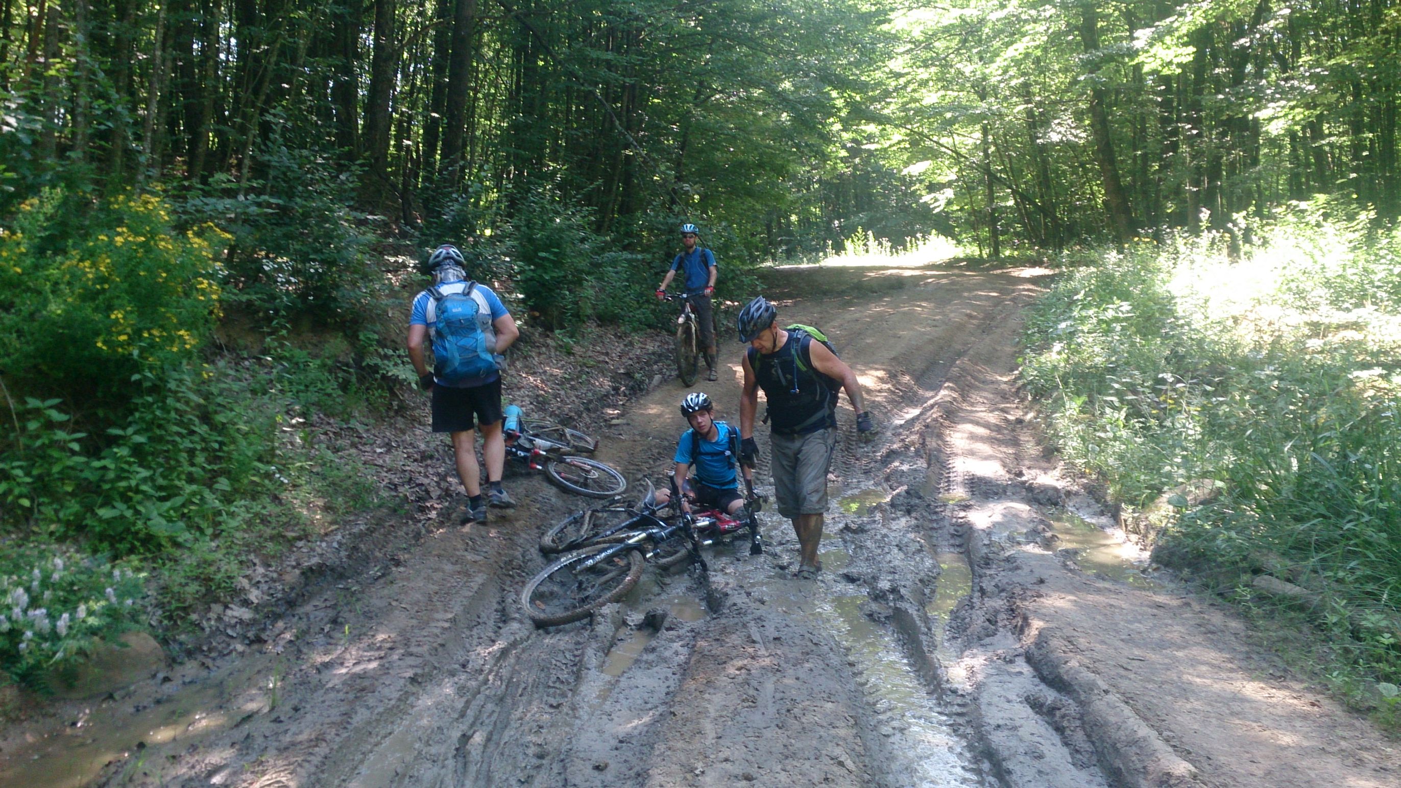 Налюбовавшись на красоту, поехали уже с Joz в авангарде. Соответственно, первыми же приняли на себя удар от маршрута - качественные, бескрайние скопища грязи :no2: Из всех сил надеясь на улучшение дороги, изначально обходили и проносили свои вело окольными путями ... поняв через пару километров всю тщетность наших потуг, Joz предложил втапливать прямо по лужам. Ну я и согласился :vava: