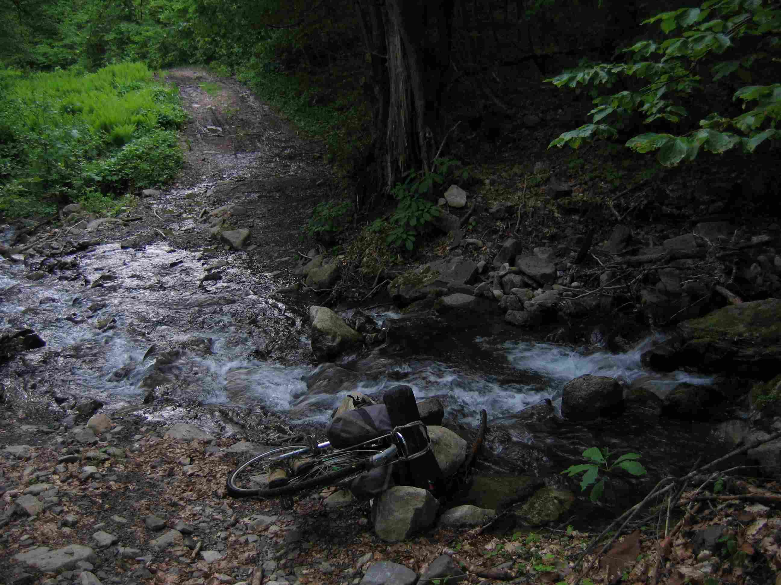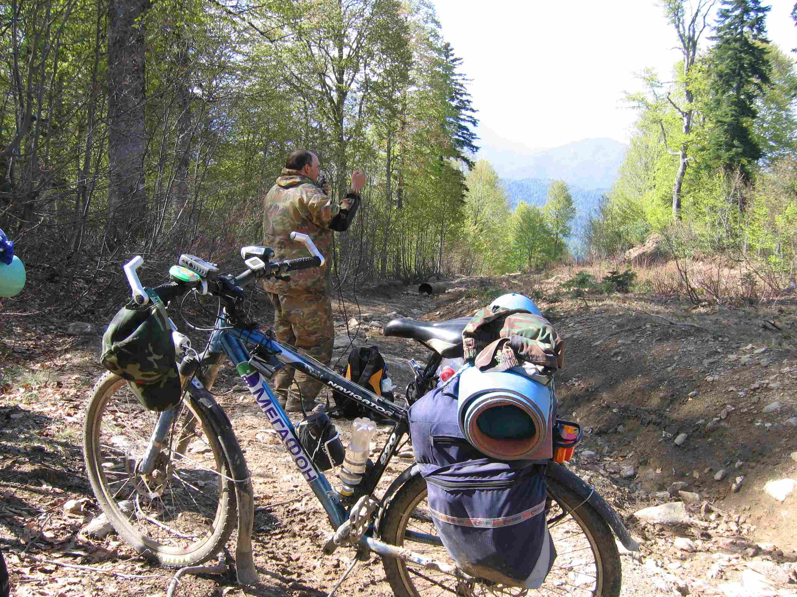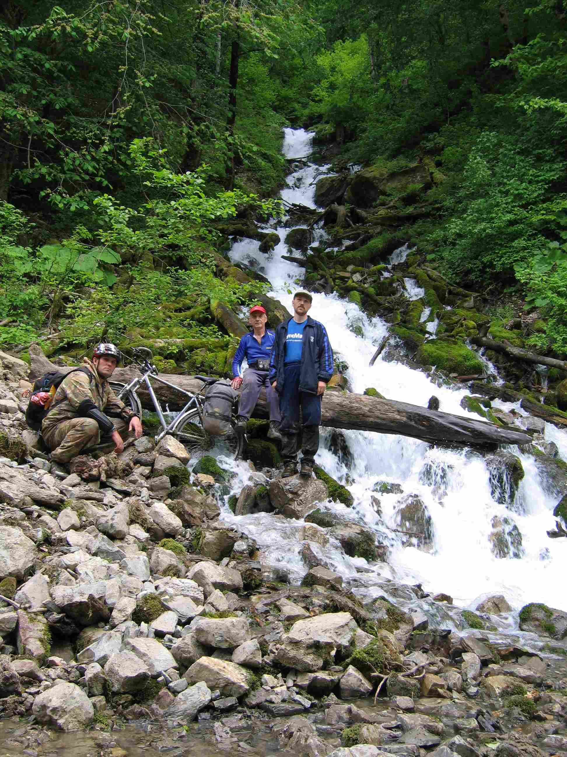 День четвёртый. Проснулись поздно в 8:00, начала сказываться усталость предыдущих дней. Не торопясь собрались, позавтракали и поехали. В Отдалённом Андрей обнаружил боковой порез камеры, устранили, набрали воды, уточнили у местных поворот на перевал и вперёд. Грунтовая дорога отсыпанная щебнем настойчиво вела вверх. Тени на дороге было не много, а воды по пути было достаточно, что позволяло нам остывать под палящим солнцем. На одном из ручьёв устроили обед, отдохнули, и покатили дальше. Счастье было не долгим – вот он поворот на перевал Грачевский…выглядит не то что бы мрачно, но впечатляюще-напряжённо: обычный волок, по которому трактора тащат брёвна из леса. Но есть и плюс – он сухой. Вобщем, глаза боятся а руки (в нашем случае ноги и руки) делают. Велики тащили на самый верх, лишь под самим перевалом стало возможным плюхнуться в седло и покатить на них. Дальше нас ждал просто сказочный спуск… В густой тени пихт и буков дорога пеляла, падала, слегка вздымалась и дарила нам незабываемые впечатления и наполняла нас эмоциями взамен тех, что мы оставили на подъёме. Хотелось нестись вниз забыв про усталость, велорюкзак на багажнике и отсутствие заднего амортизатора. И как только мы начали об этом забывать – начались падения или ошибки на грани фола. Сначала Саша ели удержал себя на спуске по булыжникам, далее улетел Андрей стесав себе голень, на очереди был я…неприятности были две. В ходе первой я успел освободиться от велика и просто пробежался дальше, а вот во второй раз после солнца влетев в тень, а затем и в грязь потерял равновесие и рухнул, на радость участникам мероприятия, в неё лицом… Первое «падение» стоило мне сломанной спицы и некорректной работы заднего переключателя по причине согнутости петуха и ноги переклюка, со вторым обошлось, ну разве что ехал дальше грязный как свинья…Спустились к реке, нашли место под стоянку и бросились отмываться, чистить велики, ужинать…Утро было поздним…